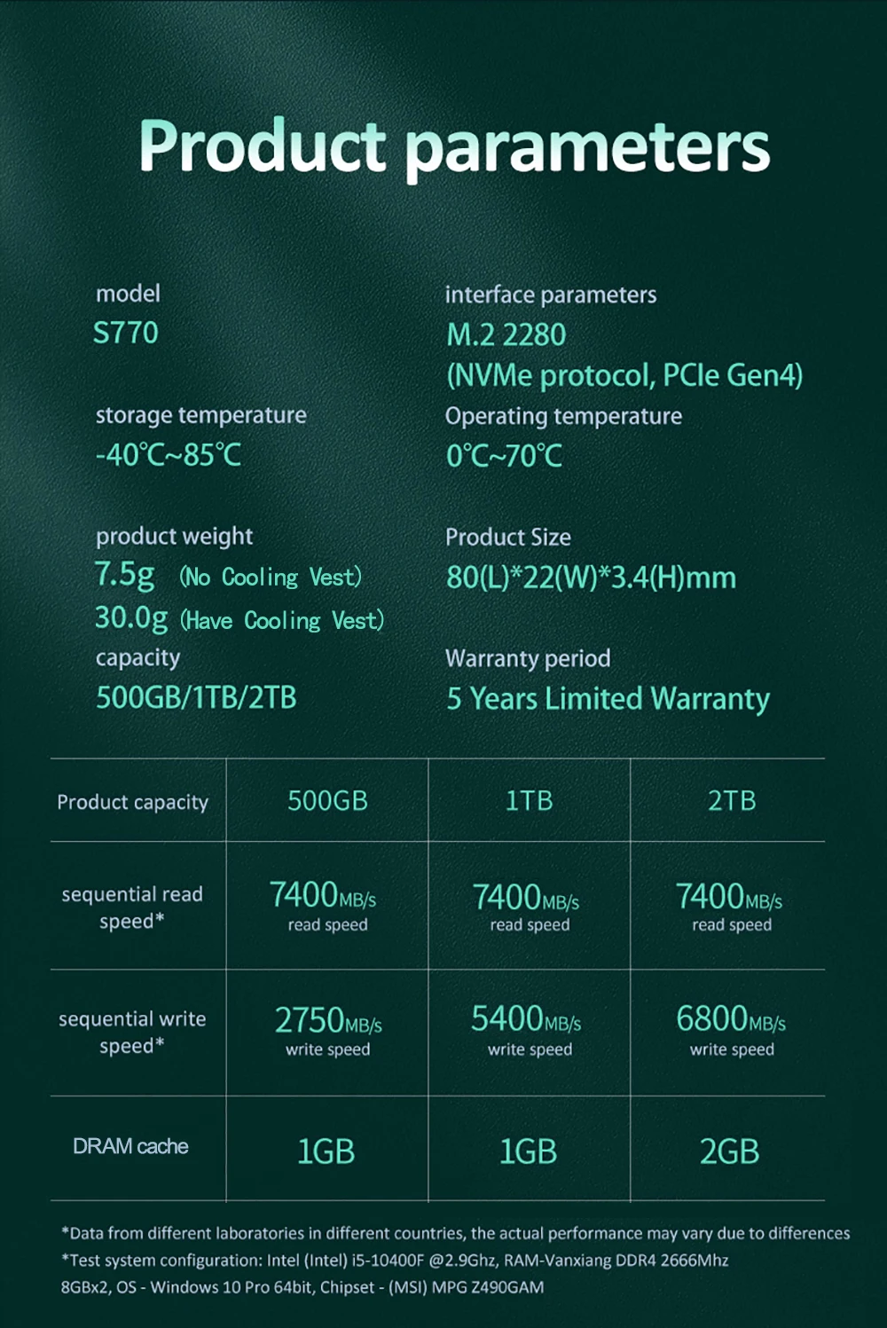 S770-2TB: Velocidad de lectura secuencial de hasta 7400 MB/s; Velocidad de escritura de hasta 6800 MB/s. Máximo a 1400 TBW. Con 2 GB DRAM Cache.