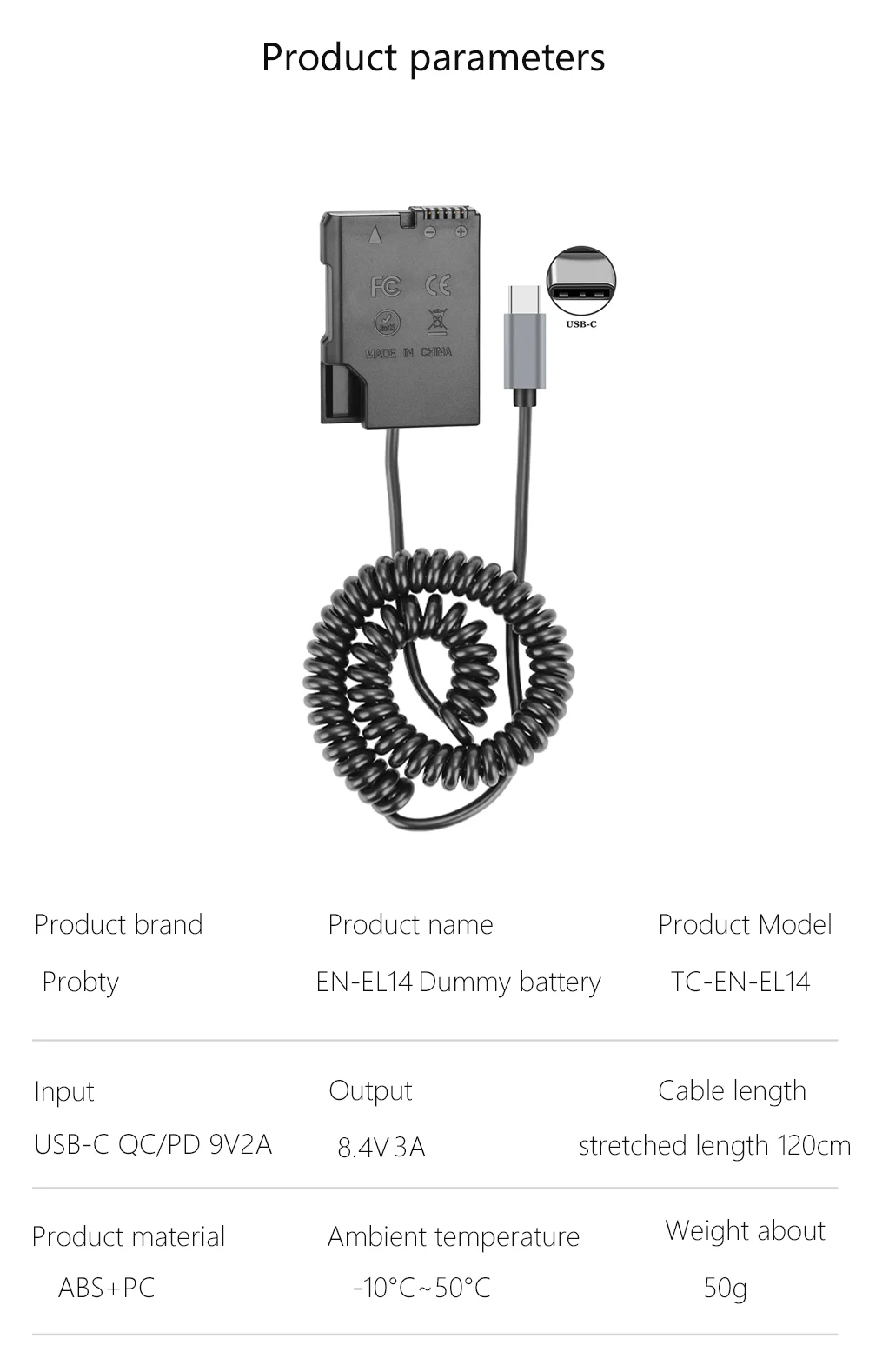 EN-EL14 Dummy Battery Un práctico reemplazo de batería de suministro para cámaras Nikon, con esta batería ficticia tipo C,