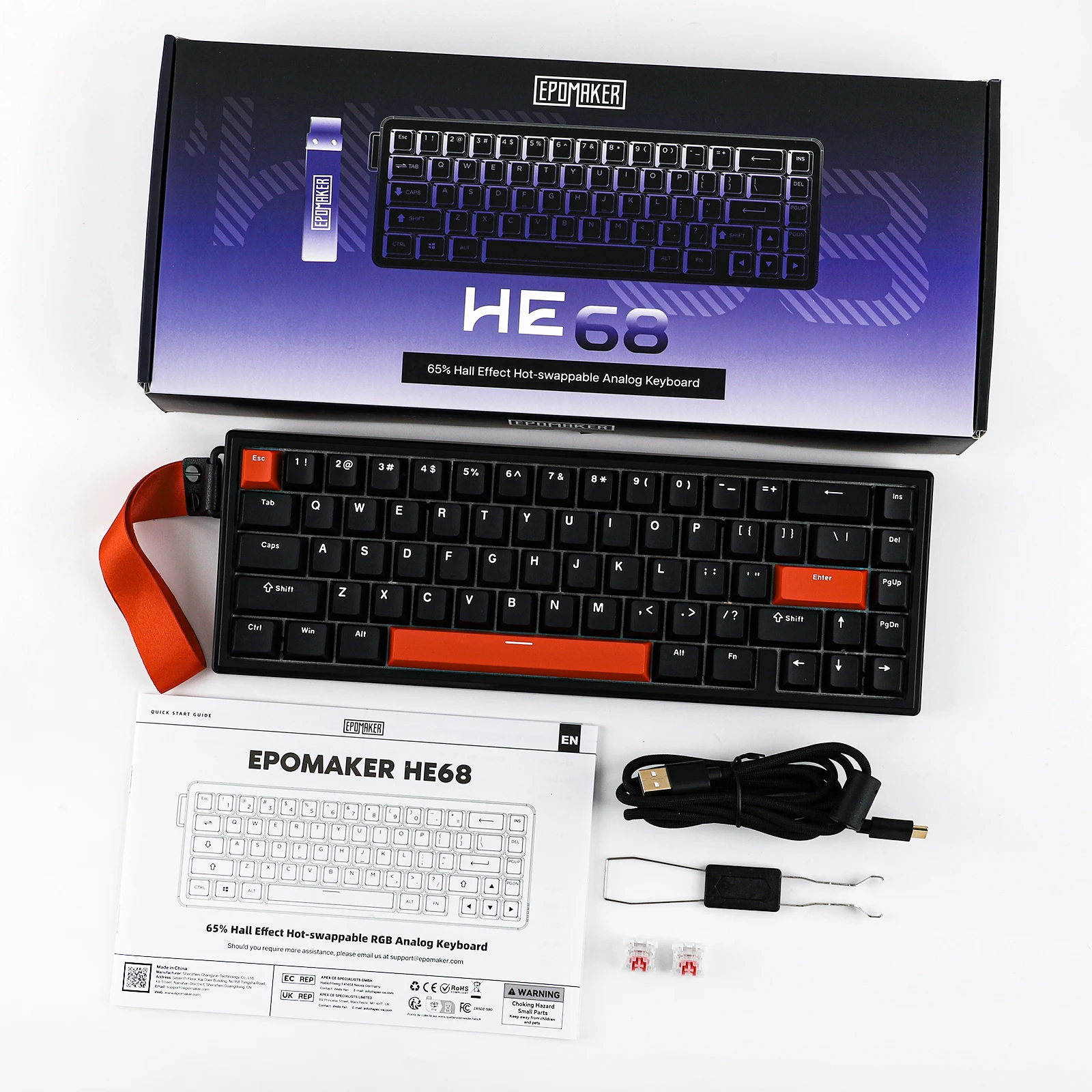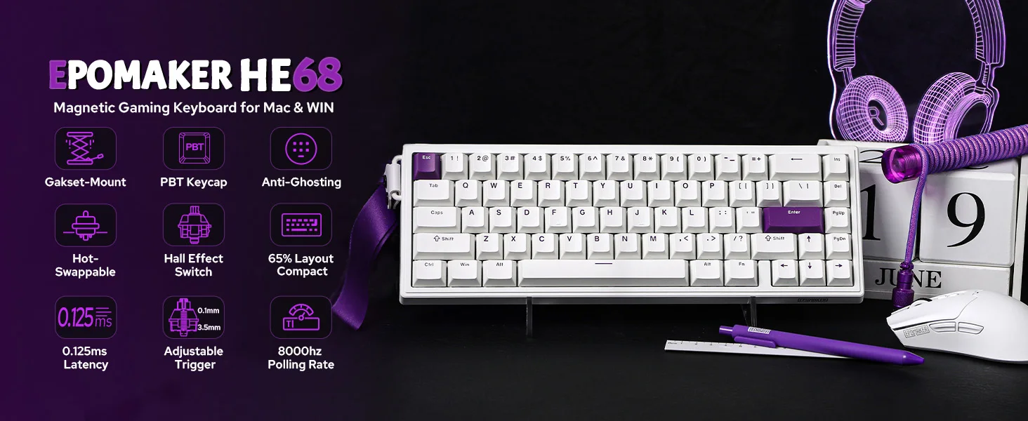 EPOMAKER HE68 65% ANSI US Layout Teclado magnético para juegos con cable efecto Hall montado en junta para Mac/WIN con tasa de almacenamiento de 8000 Hz