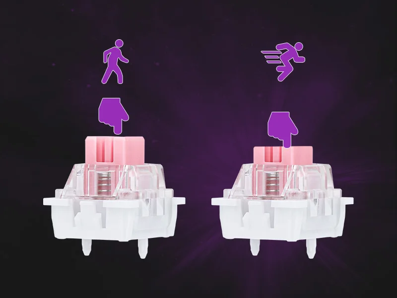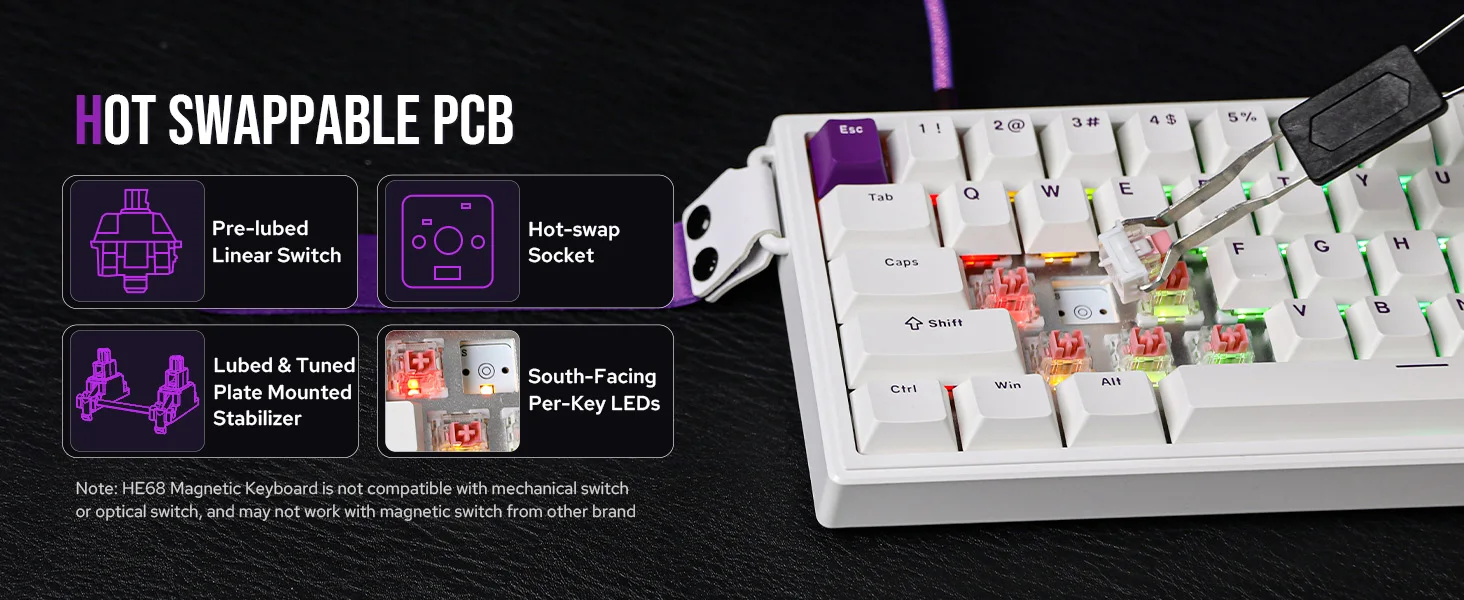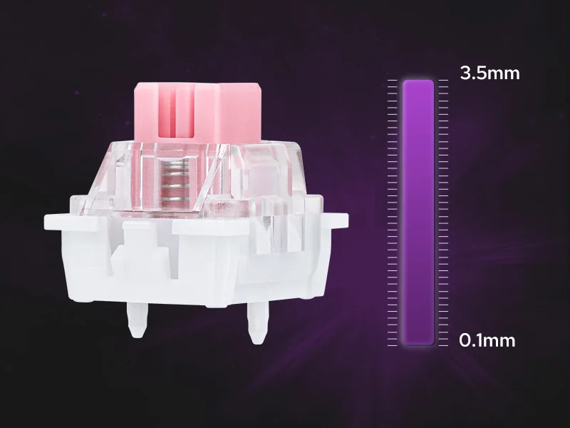 Disfrute de la sorprendente precisión y velocidad del HE68 que promete acciones formibles, para FPS, MOBA, ritmo y juegos de ocio.Con interruptores magnéticos de 45 gf preublados, cada pulsación de tecla es consistente y suave como cremosa, con una rápida entrega de acciones en la pantalla;mientras que las funciones DKS y MT permiten una verdadera entrada analógica, ya que una sola carrera ofrece hasta 4 acciones para acciones comunes y combinaciones clave.