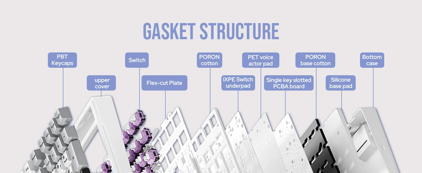 El F99 cuenta con un sofisticado diseño de cinco capas, que incorpora almohadillas debajo del eje IXPE, algodón insonorizante PORON y acolchado inferior de silicona.Esta configuración garantiza una escritura ultracómoda con sonido y golpes reducidos.