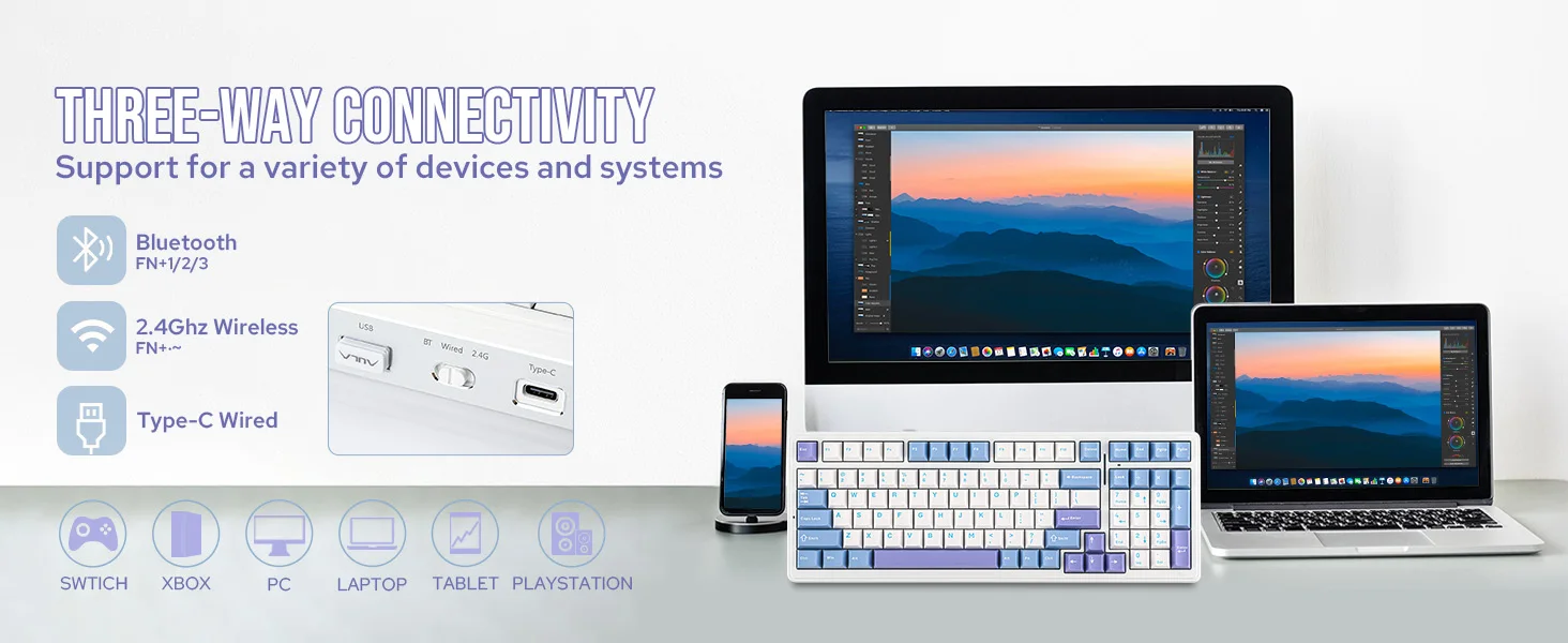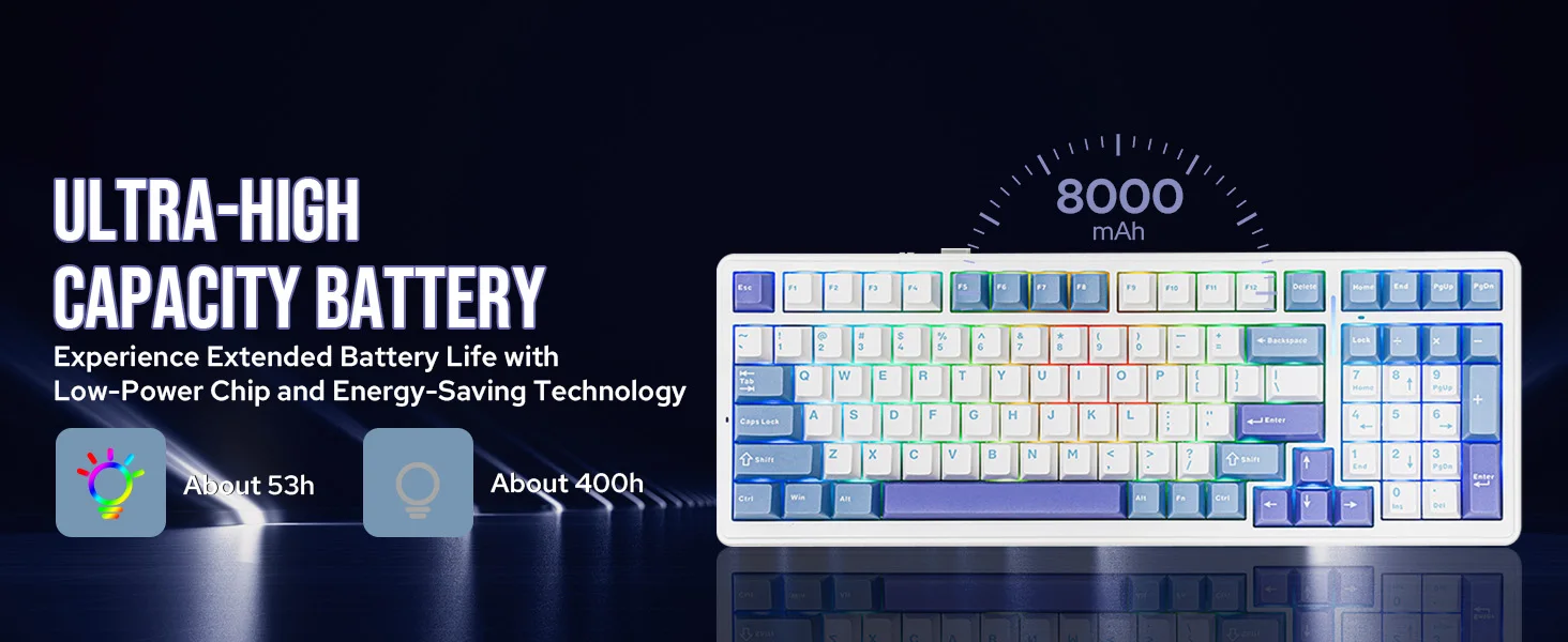 Equipado con una impresionante batería recargable de 8000 mAh, el teclado inalámbrico F99 ofrece el doble de la potencia de los teclados para juegos típicos, lo que permite hasta 400 horas de juego ininterrumpido sin retroiluminación.Su modo Bluetooth adaptable permite cambiar rápidamente entre PC/portátiles/tabletas y Windows/MacOS/iOS/Android, mientras que las opciones de cable inalámbrico y USB de 2,4 GHz garantizan estabilidad y capacidad de respuesta de alto nivel con una velocidad de sondeo de 1000 Hz.(Exclusivo del interruptor Pink Dream Sakura)