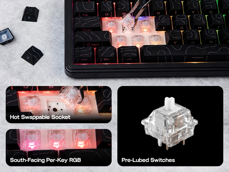 Experimente la estabilidad inquebrantable de los estabilizadores de montaje en placa finamente sintonizados, para presionar teclas consistentes y sin tambaleos, maximizando la precisión y confiabilidad en el calor de la batalla, o cámbielos por unos atornillados para una diversión personalizada.Siente el funcionamiento suave como la mantequilla de los interruptores lubricados por expertos, brindando una experiencia táctil que es a la vez receptiva y lujosa, mejorando su comodidad durante sesiones de juego prolongadas.Pruebe el ritmo silenciado satisfactoriamente de cada pulsación de tecla, logrado a través del innovador diseño de montaje en junta y un sistema de amortiguación de sonido de 5 capas meticulosamente elaborado, eliminando resonancia no deseada y creando un paisaje sonoro verdaderamente inmersivo.