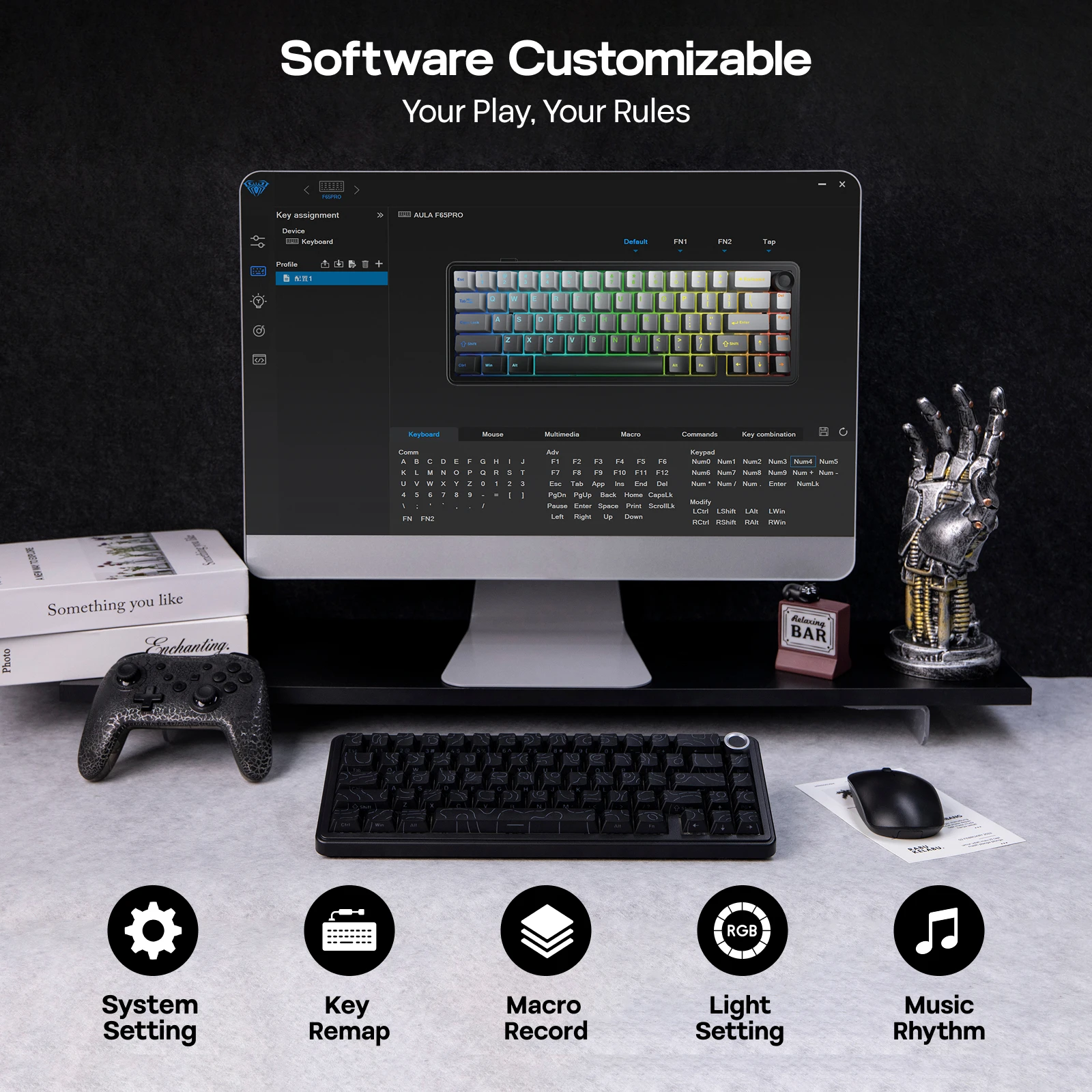 Domina el campo de batalla digital con nuestro teclado para juegos F65 PRO, diseñado para brindar una capacidad de respuesta incomparable y un control personalizable.Compacto con 66 teclas y 1 perilla, este teclado con diseño de 65% libera un valioso espacio en el escritorio para maniobrar el mouse mientras empaqueta el impacto de una potencia de tamaño completo, incluidas teclas de flecha para una navegación rápida, FN+WIN para bloquear la tecla WIN contra interrupción. y FN+L_Ctrl para obtener el número duplicado como filas FN.Libera tus propiedades estratégicas con macros programables, simplificando comandos complejos para una sola pulsación de tecla; Siente la respuesta ultrarrápida del sondeo de 1000 HZ en modo 2,4 Ghz/USB, eliminando el retraso en los bordes competitivos.