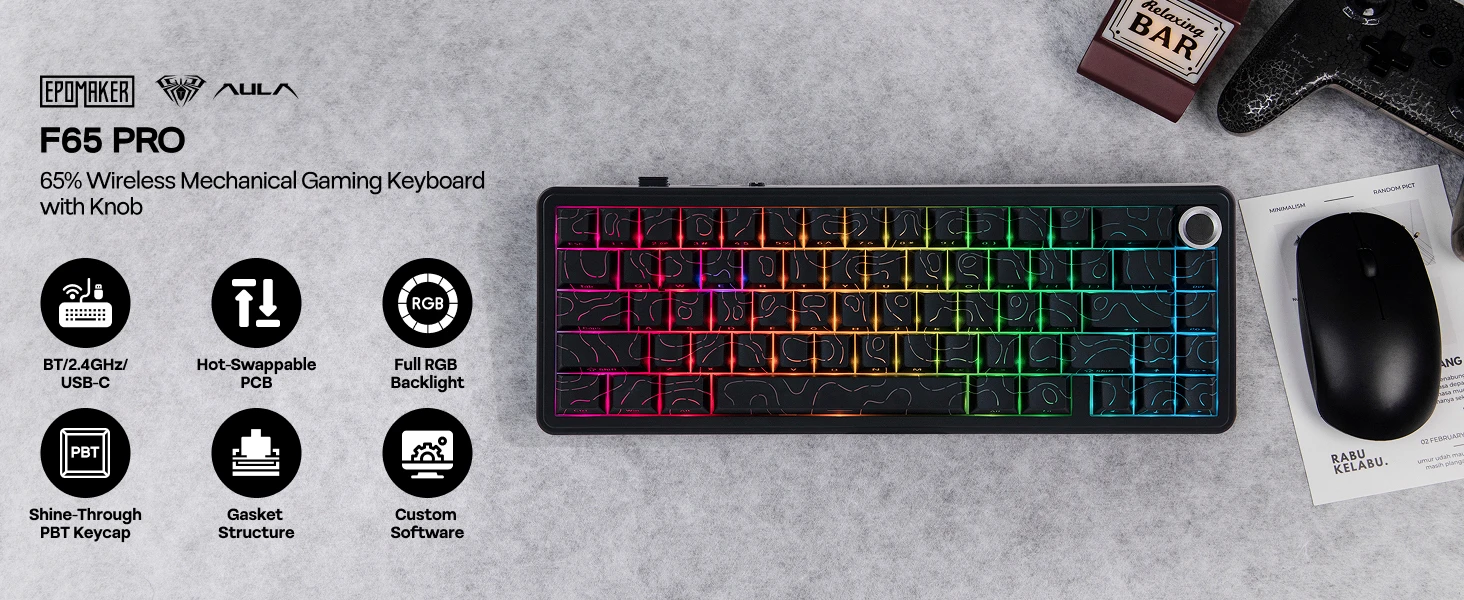 EPOMAKER x AULA F65 PRO 65% ANSI QWERTY Layout Junta de intercambio en caliente con cable/2,4 GHZ/Bluetooth Teclado mecánico inalámbrico Retroiluminación RGB
