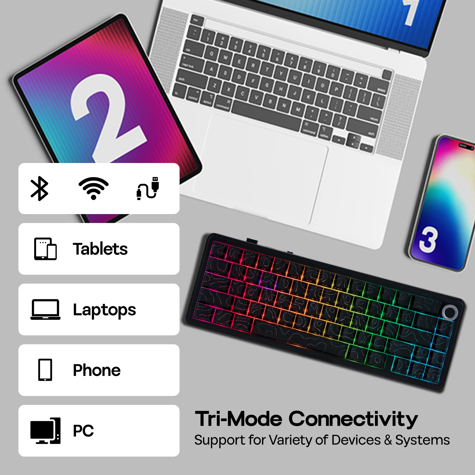 Desbloquee la infinidad de la versatilidad del teclado y el control perfecto con nuestro F65 PRO como verdadero cambio de juego para una configuración de escritorio y un espacio de trabajo aerodinámico.Aproveche la libertad de la conectividad inalámbrica, cambiando sin esfuerzo entre Bluetooth, 2.Modos inalámbricos y con cable de 4 GHz para adaptarse a cualquier configuración o dispositivo, ya sea para su computadora de escritorio, computadora portátil Mac, tableta Android o teléfono;y mejore su flujo de trabajo con el control de perilla intuitivo, que permite ajustes rápidos de volumen y luz de fondo sobre la marcha sin complicados cadenas de teclas o menú desplegable para mantenerlo concentrado en la acción.