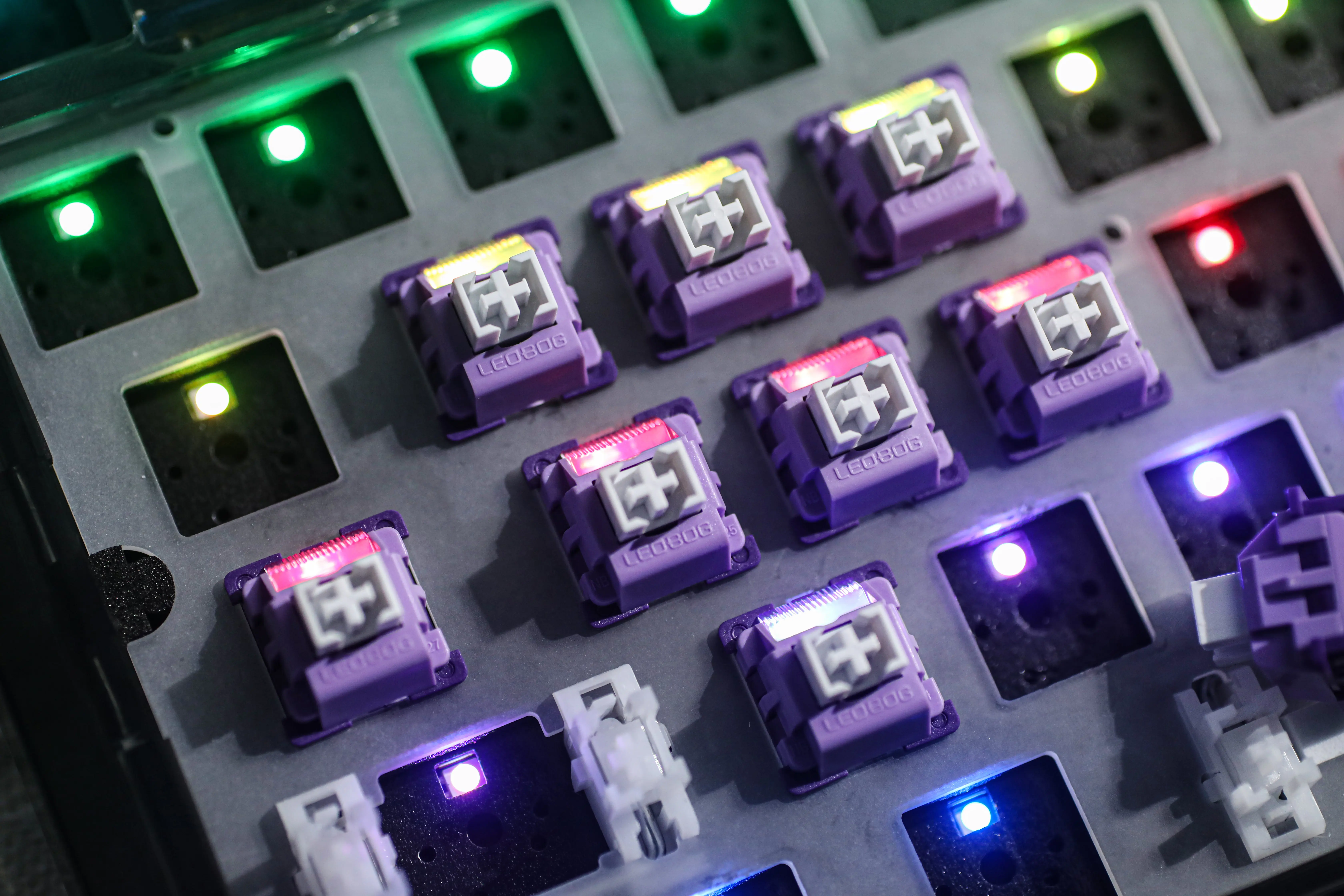 El interruptor LEOBOG Purple King viene con difusores de luz que mejoran el brillo de la iluminación RGB, añadiendo un toque dinámico a su entorno de escritura personalizado.