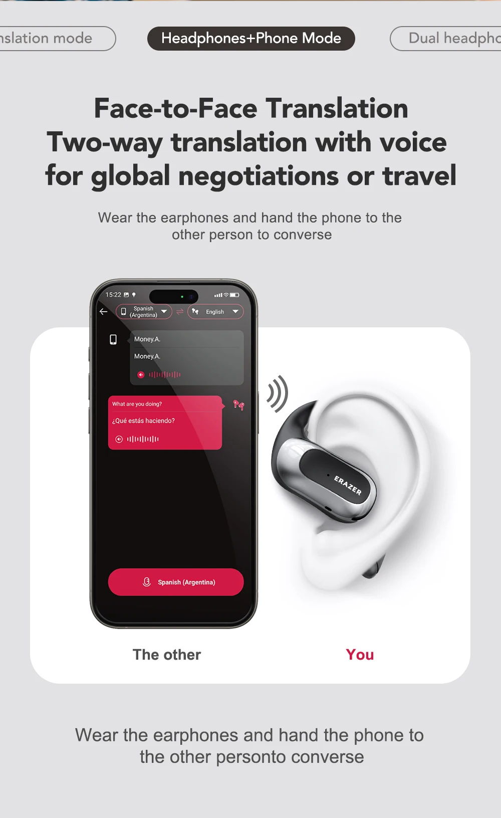 Un lado usa unos auriculares y el otro lado sostiene un teléfono celular, y cuando el otro lado habla un idioma extranjero, los auriculares se traduce instantáneamente.