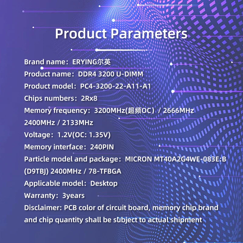 Comprar ERYING-memoria RAM DDR4 para ordenador de escritorio, 16GB, 3200Mhz, U-DIMM, para juegos, personalizada para i7, i9, Kit de placa base (sin disipador de calor)