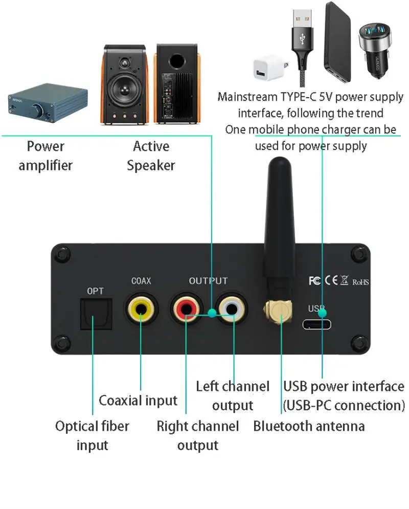 Por favor NOTA:1. La interfaz USB C se puede utilizar como fuente de alimentación y, al mismo tiempo, también puede conectar la PC como tarjeta de sonido; cuando esté en uso, cambie la entrada a ''BT'' y desconecte de Bluetooth.