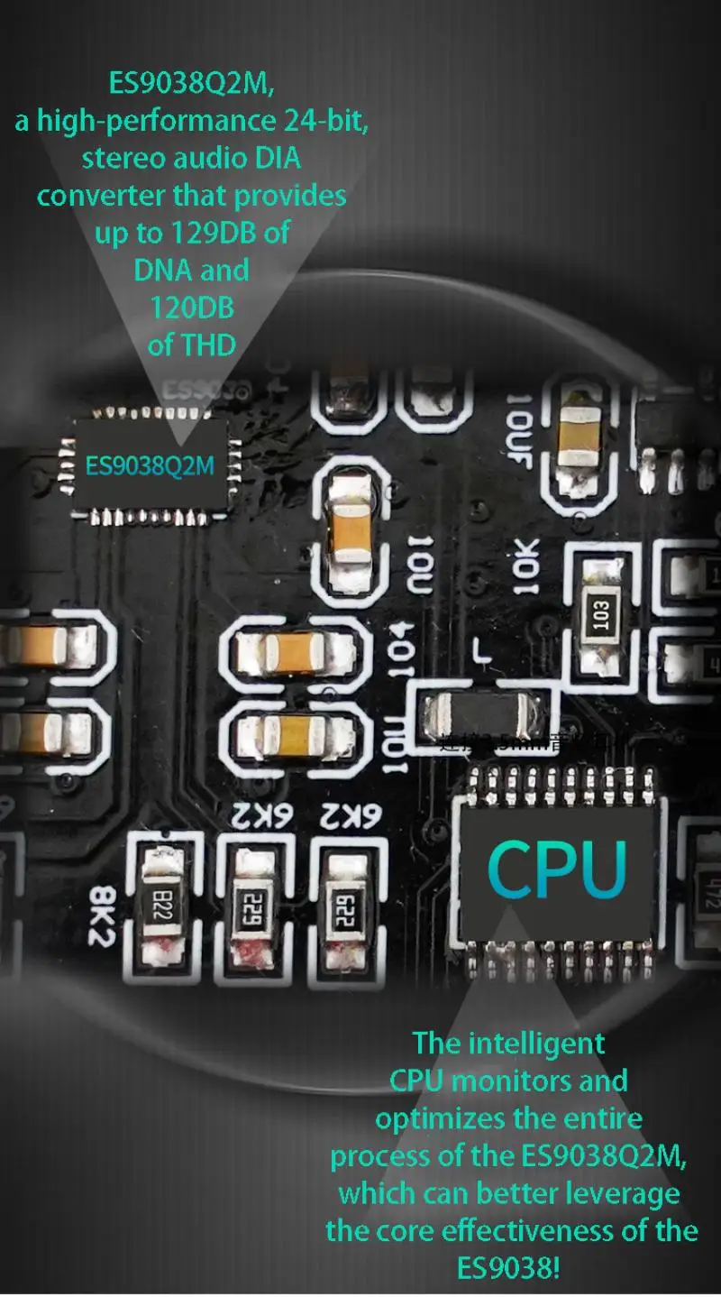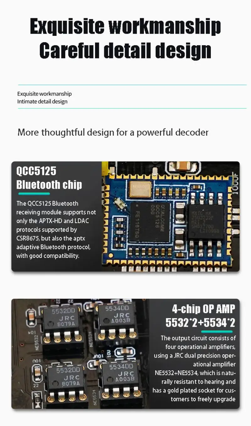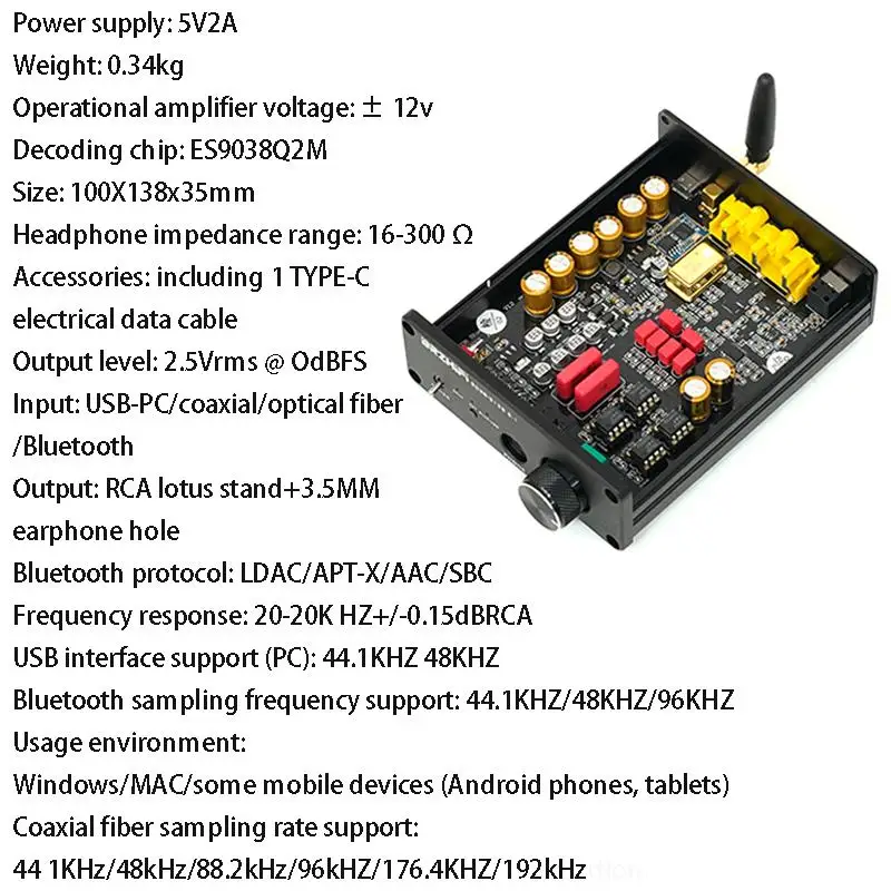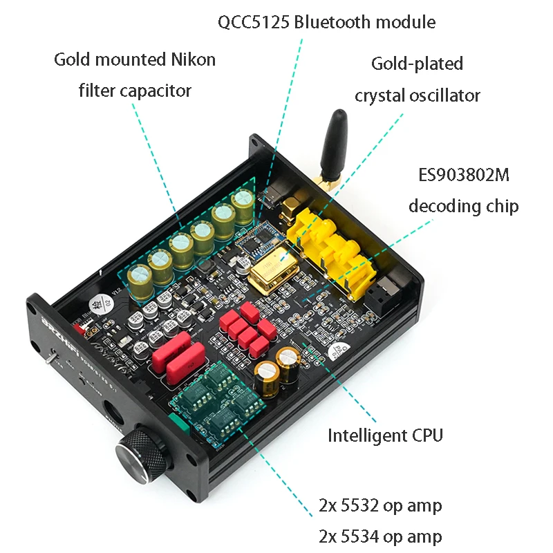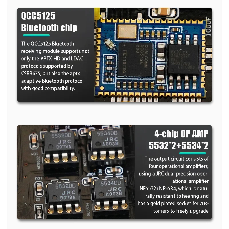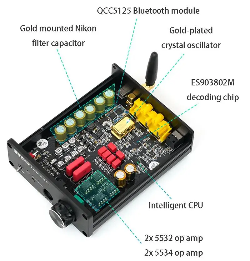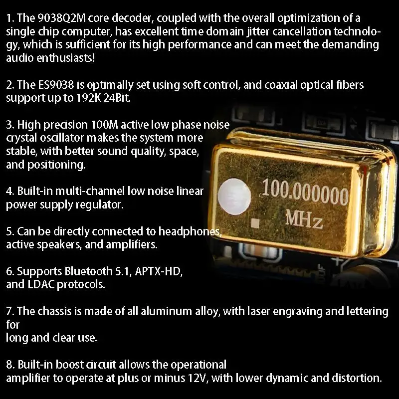 Características:1.Usando el chip decodificador ES9038Q2M, la calidad del sonido mejora perfectamente y el último chip Bluetooth QCC5125, la reproducción del teléfono móvil también puede lograr un buen sonido.