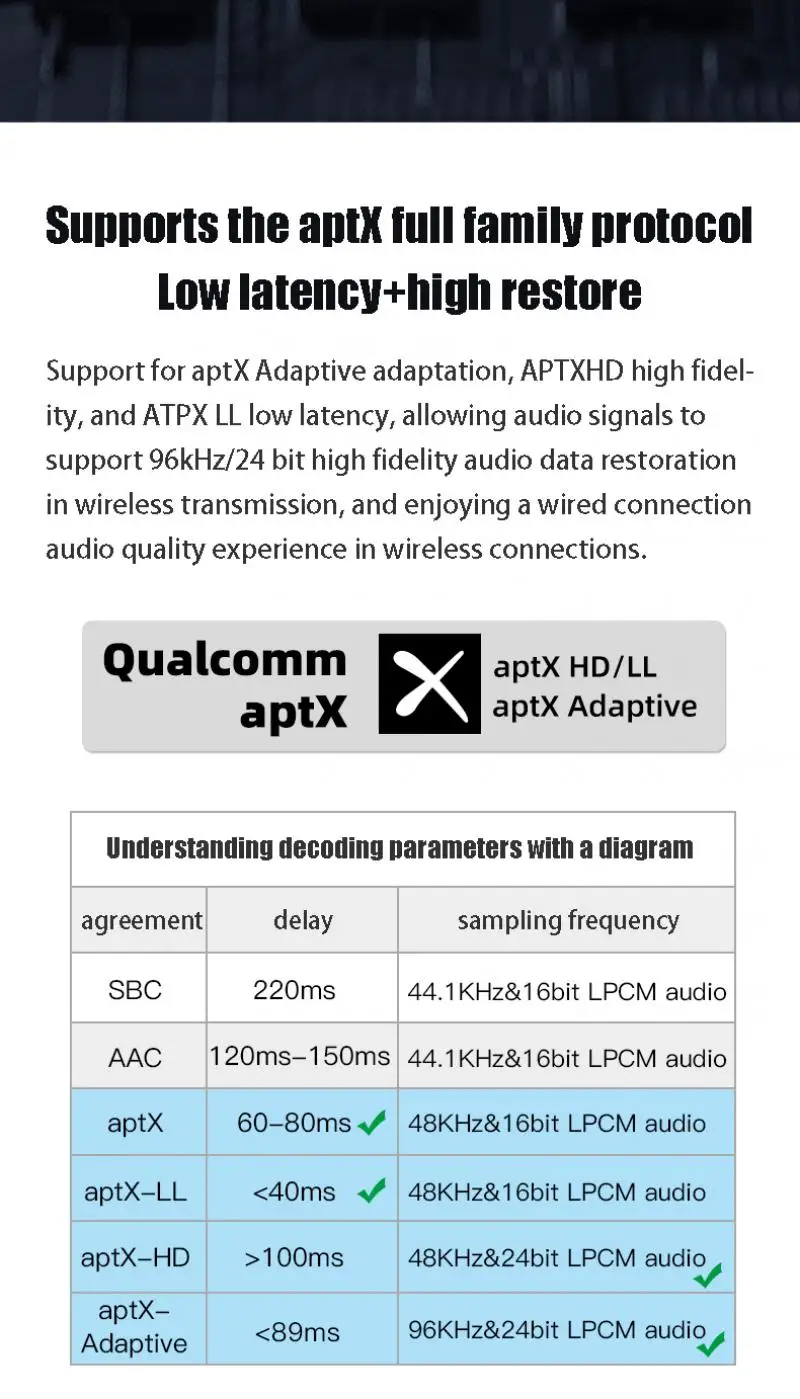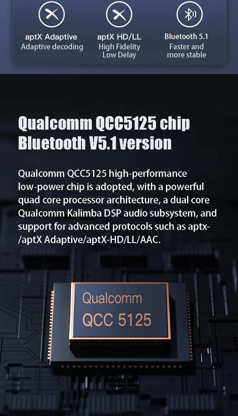 -Bluetooth: QCC5125, soporte: SBC/AAC/APTX/APTX-LL/APTX-HD/LDAC(96KHz)/APTX-Adaptable