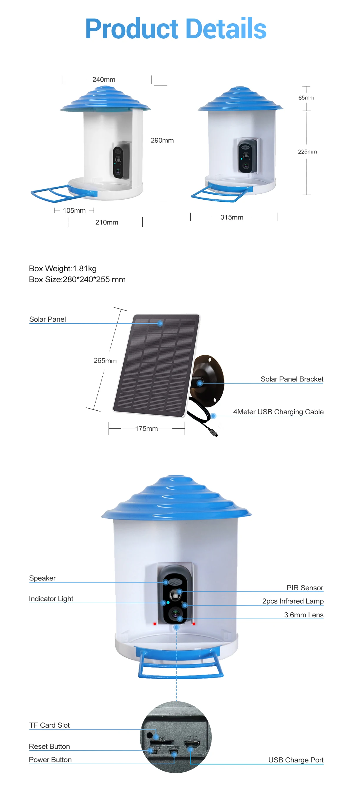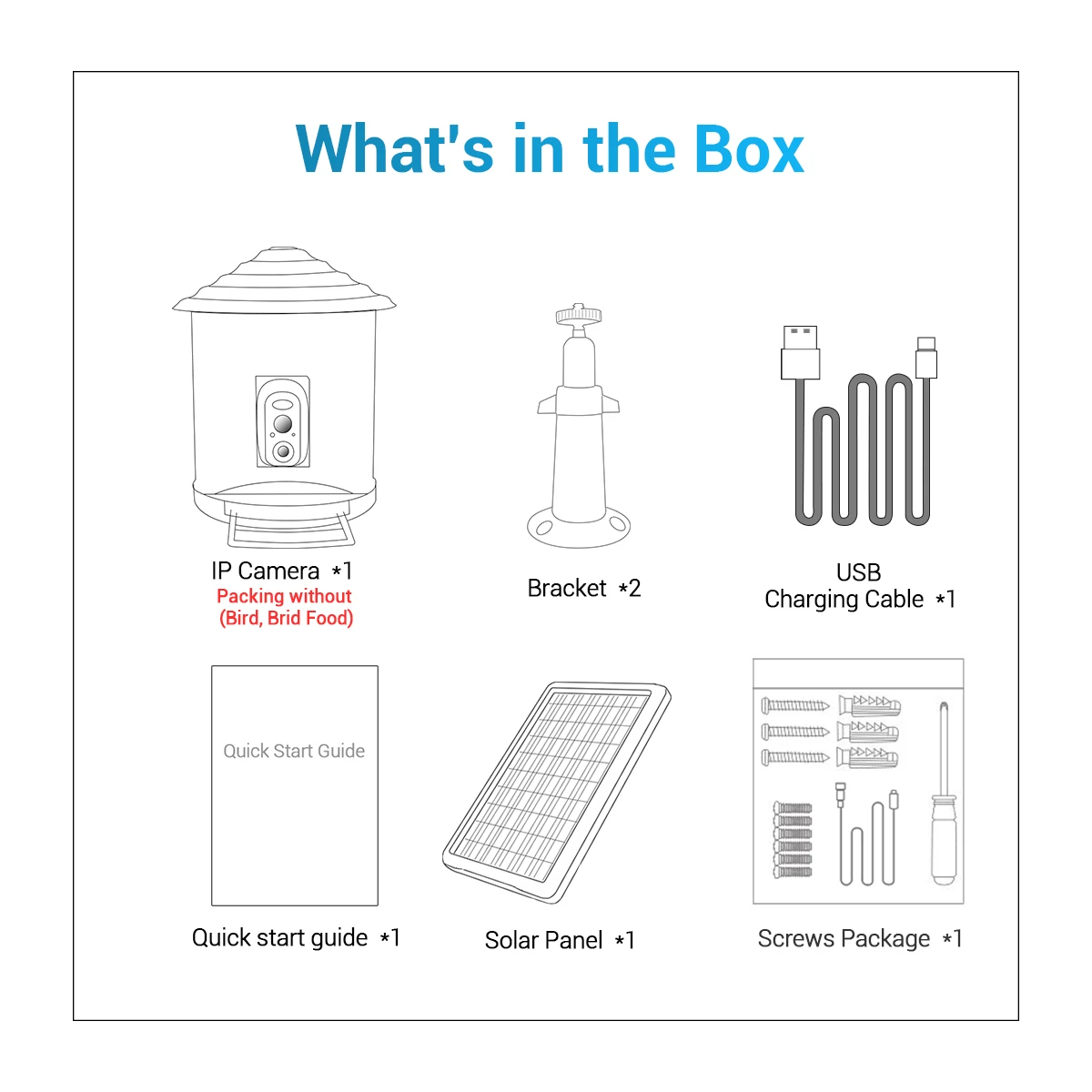 Lista del paquete: cámara WIFI * 1, panel solar * 1, kit de tornillos * 1, cable de carga USB * 1, manual de usuario * 1, soporte * 1, comedero para pájaros * 1