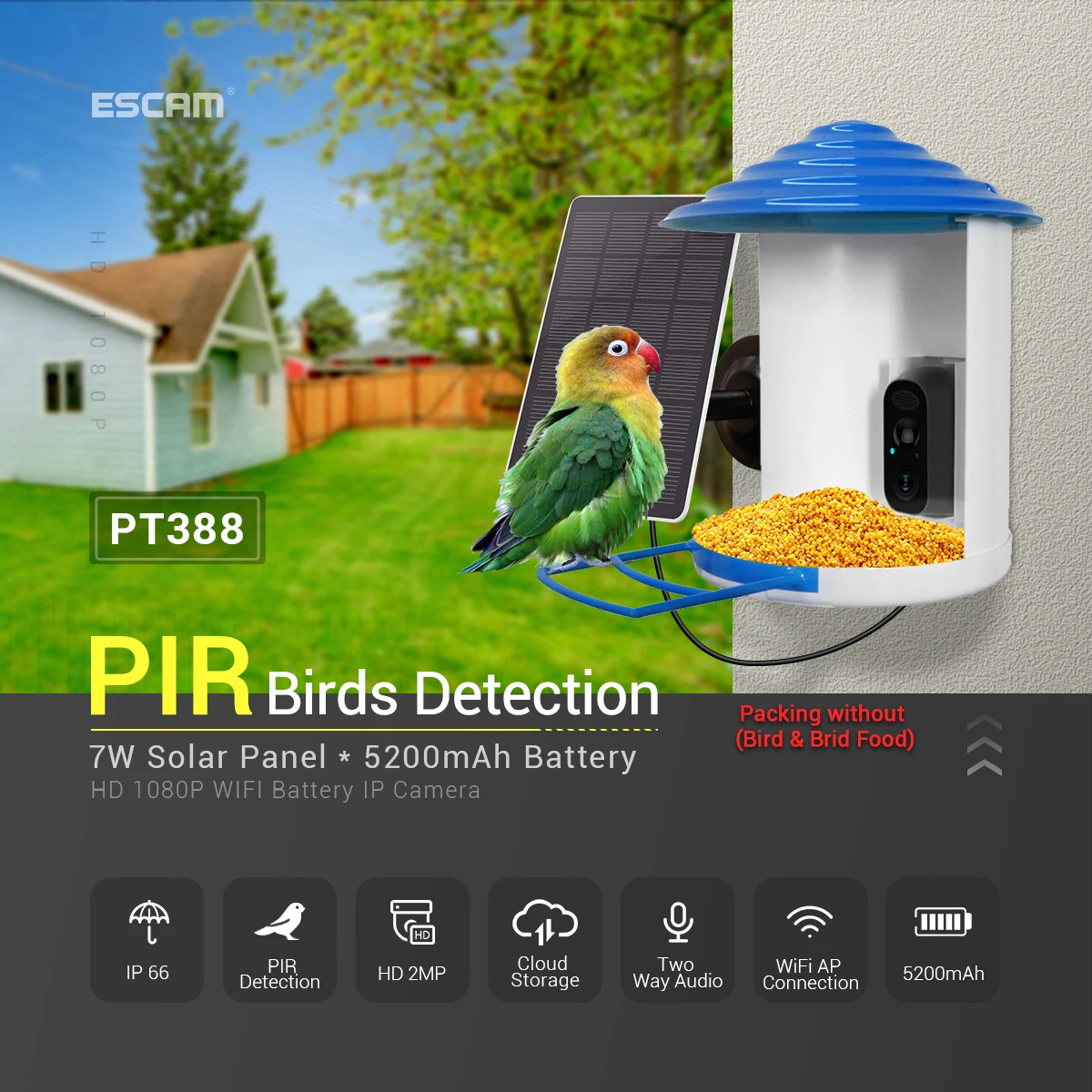 Comprar ESCAM-cámara IP de detección de movimiento para exteriores, Monitor inalámbrico de seguridad, impermeable, con casa de pájaros, Panel Solar, PIR, 3MP, PT389