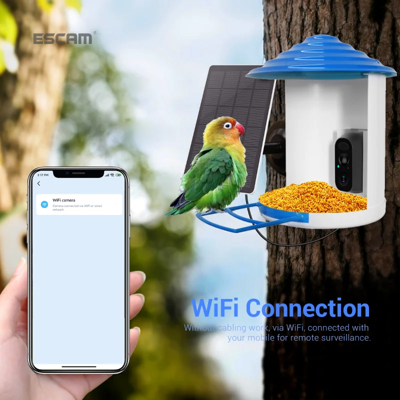 Comprar ESCAM-cámara IP de detección de movimiento para exteriores, Monitor inalámbrico de seguridad, impermeable, con casa de pájaros, Panel Solar, PIR, 3MP, PT389
