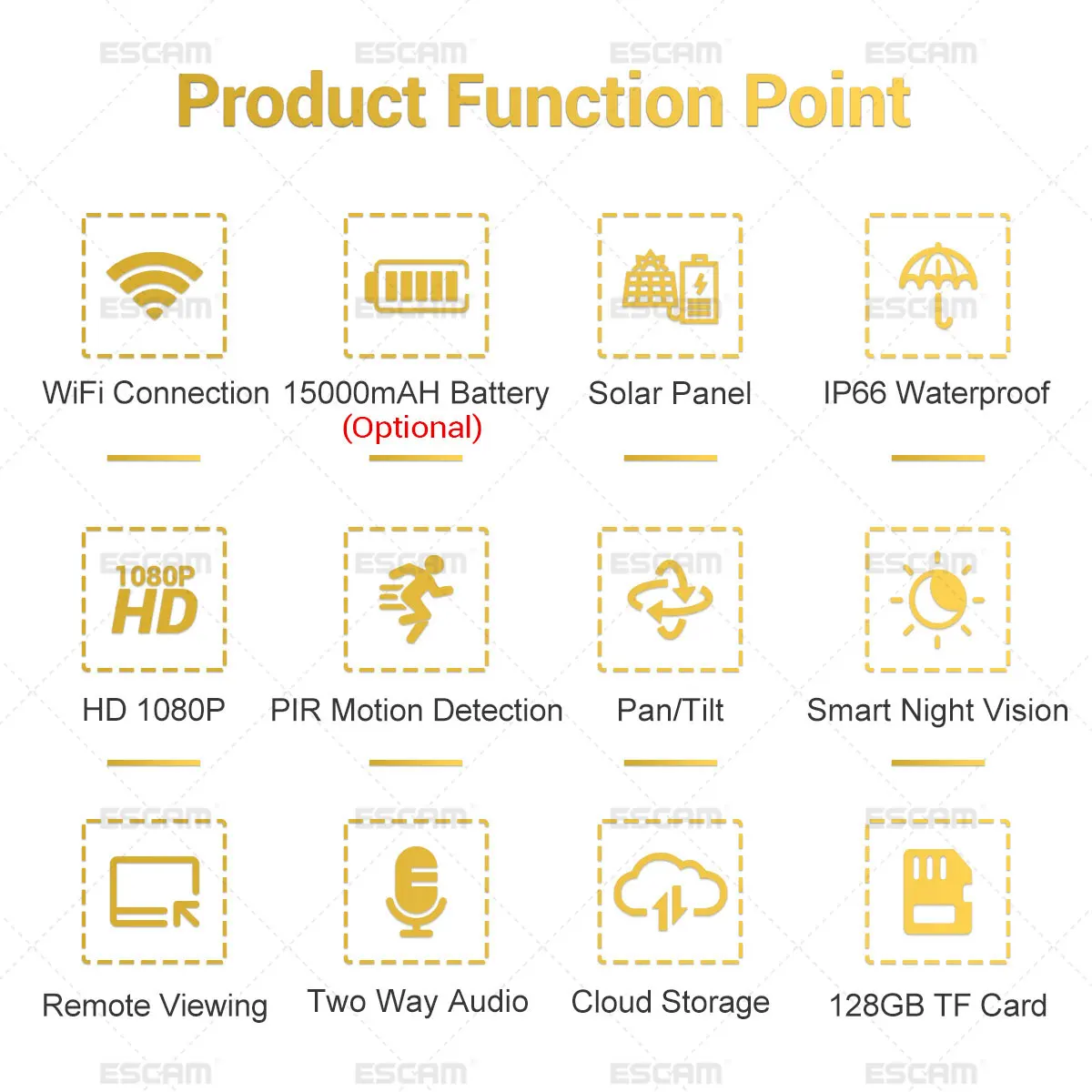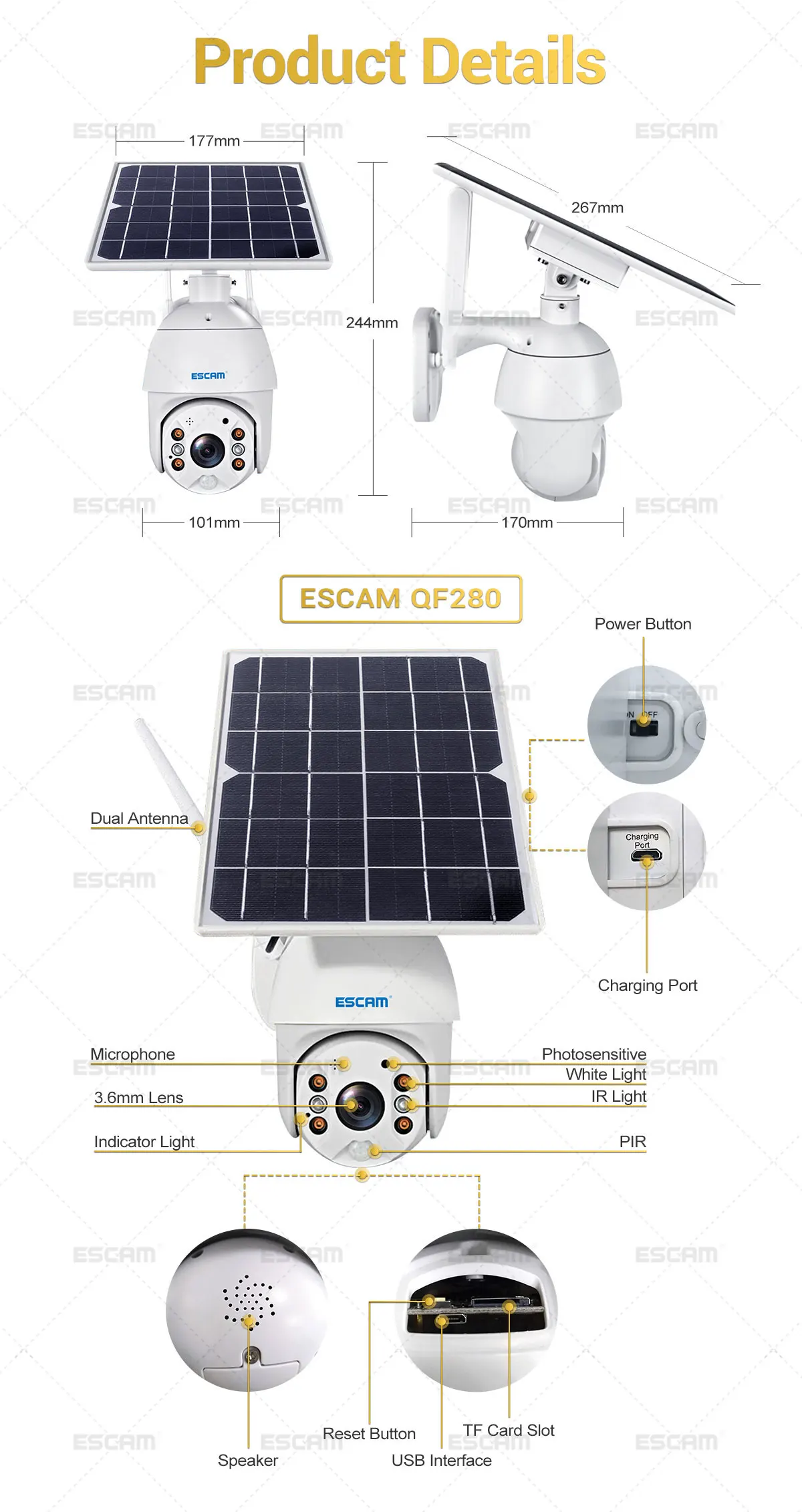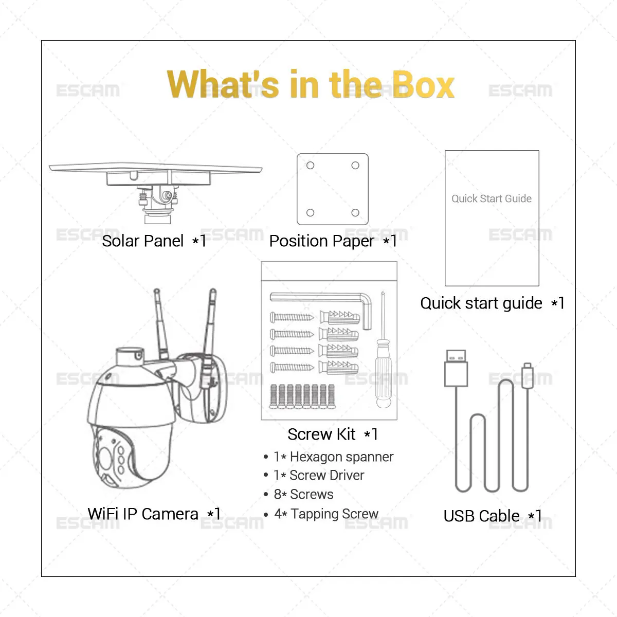 Paquete incluido:1 x Cámara solar WiFi ESCAM QF280 1080P 1 panel solar 1 guía de inicio rápido 1 Papel de posición 1 x kit de tornillos 1 x cable USB
