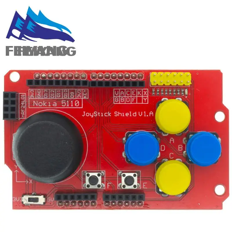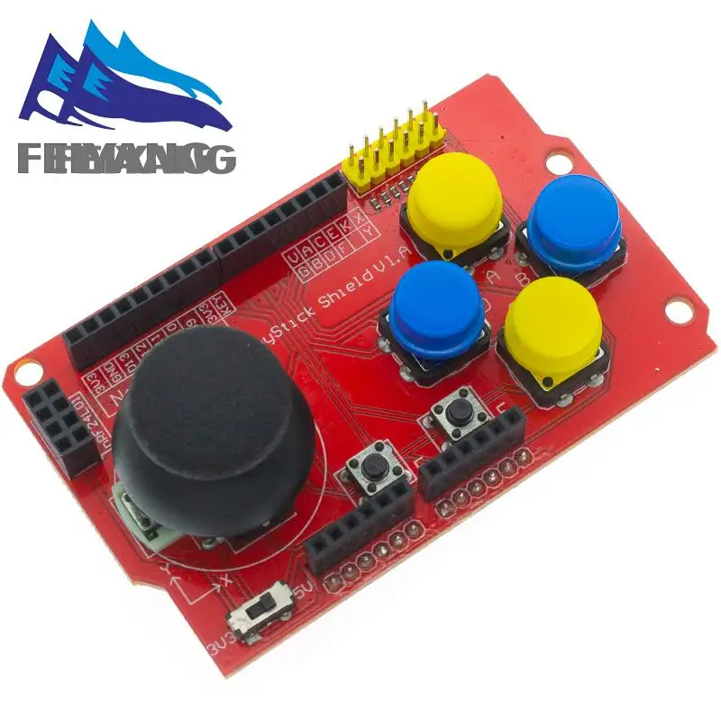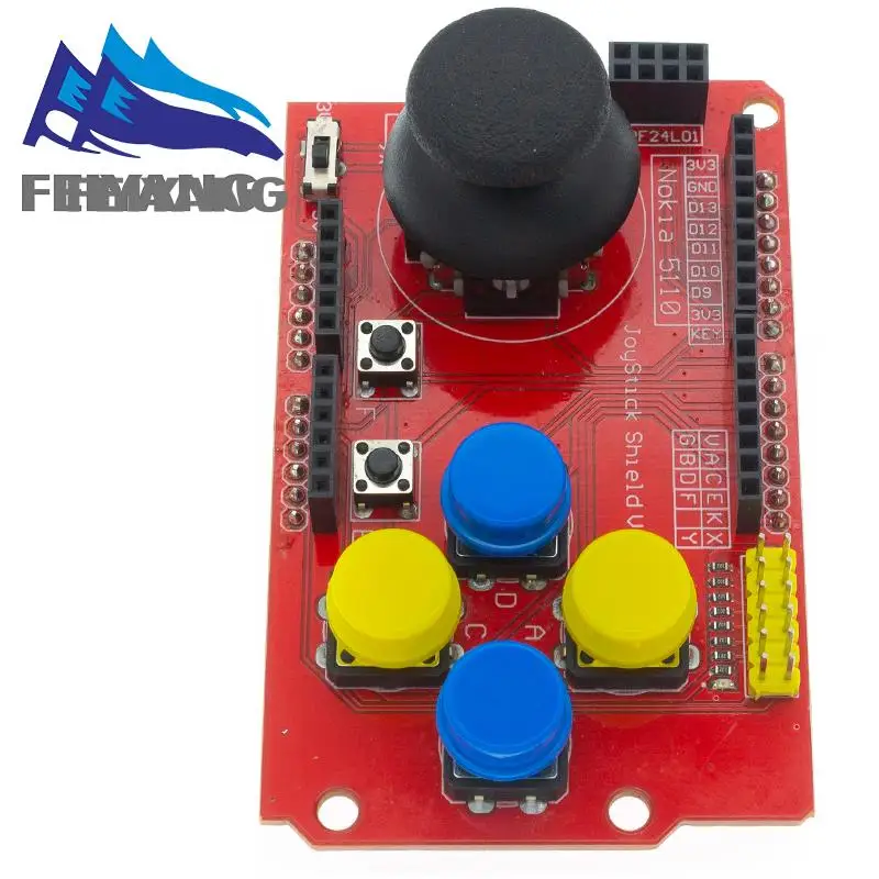 Mientras tanto, JoyStick Shield con un joystick cruzado PS2 con botones, hay cuatro botones redondos y 2 botones pequeños. Proporciona expansión de entrada de joystick y botones. Los interruptores integrados pueden cambiar entre 3,3 V y 5 V, pueden usar este modelo para otras plataformas de microcontroladores de 3,3 V, como STM32.