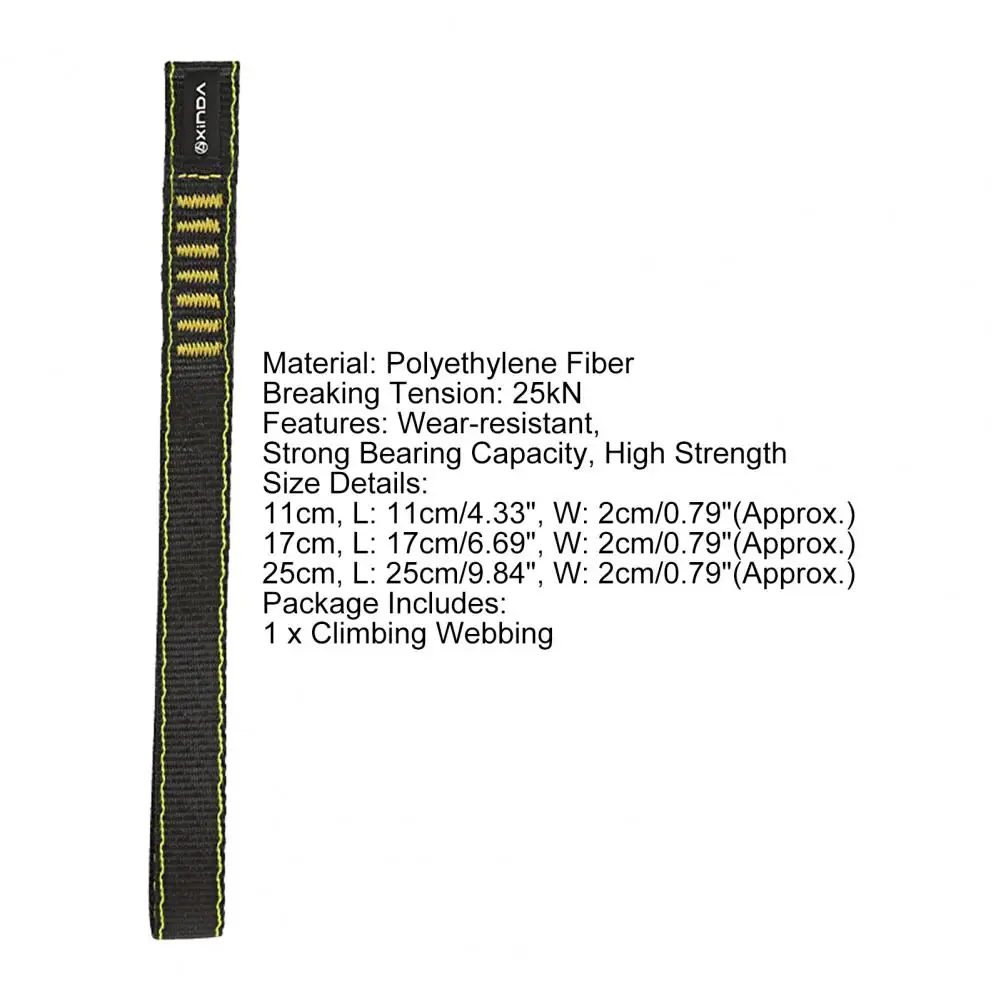 Con alta resistencia a la tracción y al desgaste, la correa mejora el factor de seguridad del sistema de protección. El contacto directo con el fulcro de protección reduce el desgaste y la torsión de la cuerda. Es una herramienta ampliamente utilizada para uso en exteriores, se utiliza para conectar hebillas de escalada, cerraduras de hierro y elevadores.