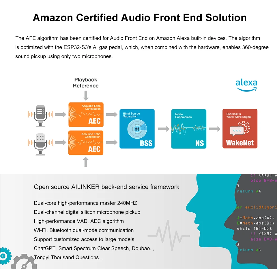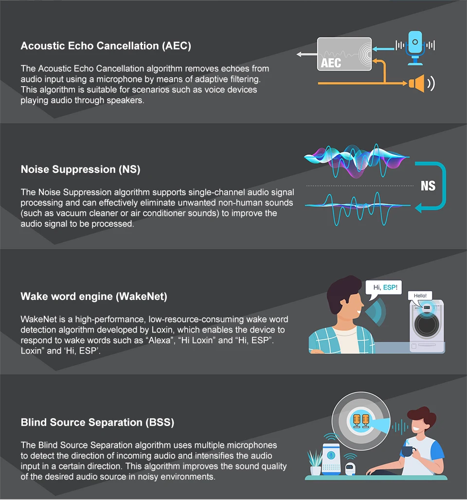 Soporte para el marco de activación por voz Espressif WakeNet, compatible con activación por voz de doble canal, mejorando la velocidad y la distancia de activación.