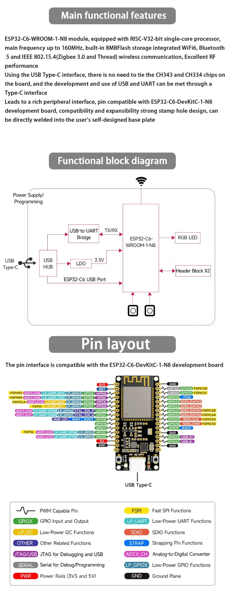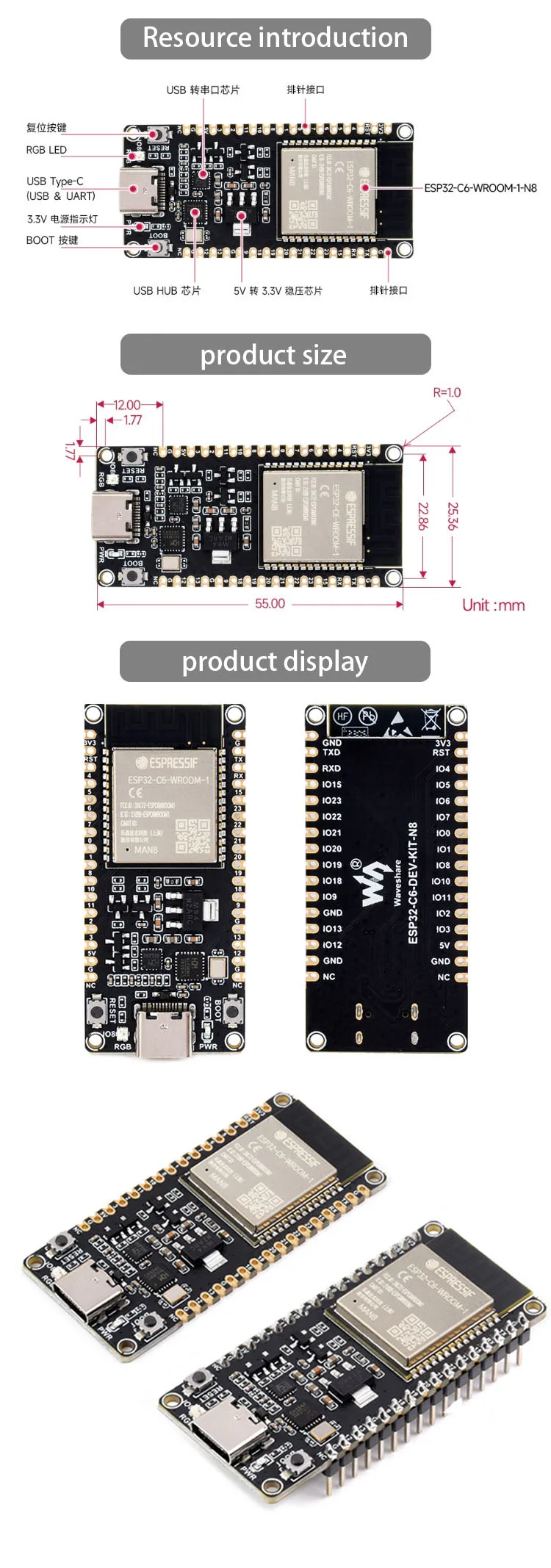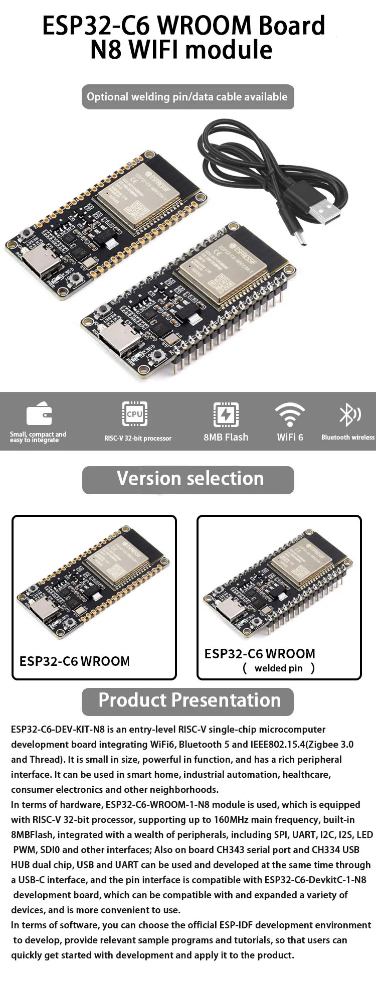 ESP32-C6-DEV-KIT-N8 Placa de desarrollo ESP32-C6-WROOM-1-N8 ESP32-C6-WROOM WiFi + módulo Bluetooth Placa central ESP32-C6-DEV-KIT-N16