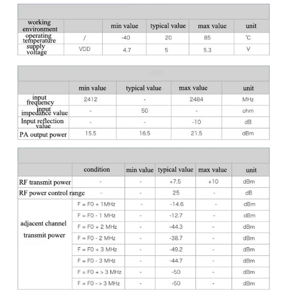 5.Alto rendimiento:El módulo admite tarjetas TF de hasta 4 GB y tiene 9 puertos IO, lo que brinda a los usuarios una mayor flexibilidad en los casos de uso.Transmite a niveles de potencia altos de 17±2dBm (@1lMbps) para 802.l1b, 14±2dBm (@54Mbps) para 802.l1g y 13±2dBm (@MCS7) para 802.l1n, transmitiendo datos de forma rápida y eficiente.