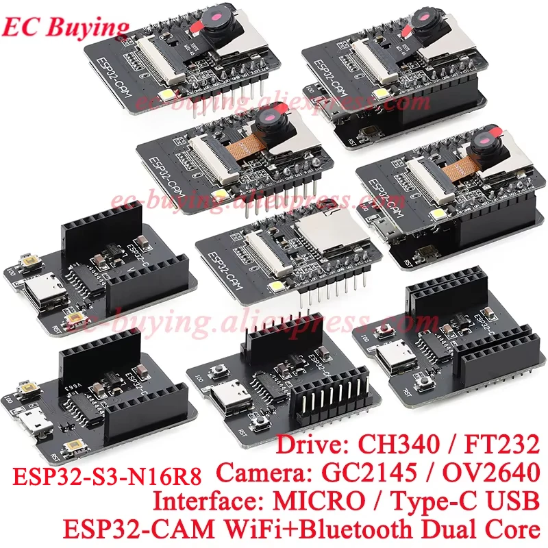 Comprar ESP32-CAM-MB ESP32 Serial to WiFi BLE Type-C MICRO Camera Module Development Board CH340 FT232 GC2145 OV2640 OV3660 ESP32-S3-N16
