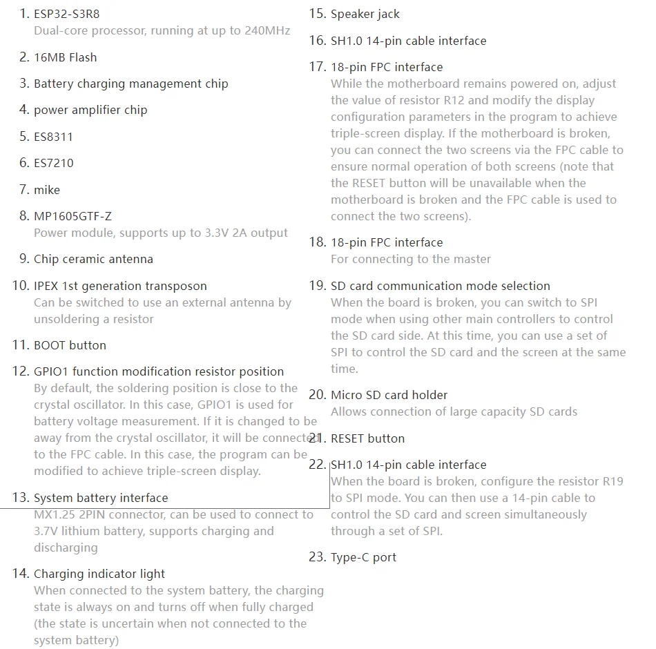Codec de audio ES8311 integrado y chips ADC de audio ES7210, y equipados con interfaces de micrófono y altavoz estándar, que admiten la interacción de voz AI