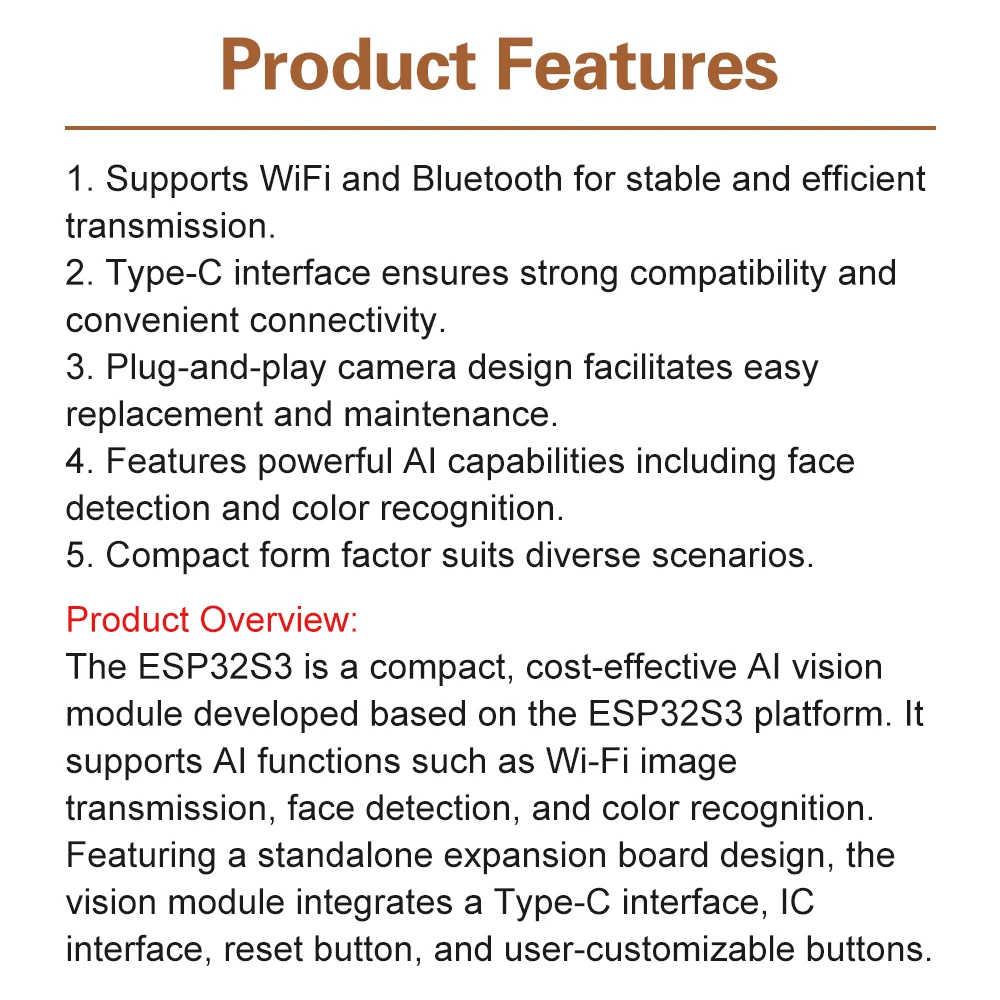 ESP32S3 es un módulo de visión de IA de tamaño mini y rentable desarrollado en base a ESP32S3, que admite funciones de IA como retroalimentación de imágenes WIFI, detección de rostros, reconocimiento de colores, etc.El módulo visual adopta un diseño de placa de expansión independiente, que está equipado con interfaz tipo C, interfaz IC, botón de reinicio, botones definidos por el usuario y otros botones.