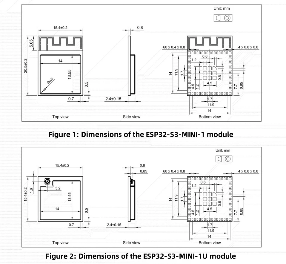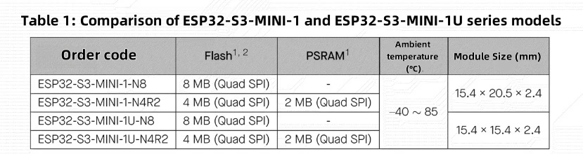 El ESP32-S3-MINI-1 utiliza antenas PCB integradas, mientras que el ESP32-S3-MINI-1U utiliza conectores para conectar antenas externas.Dos módulos están configurados con un máximo de 8 MBSPIflash y algunos módulos están configurados con 2 MBSPIPSRAM.Los ESP32-S3-MINI-1 y ESP32-S3-MINI-1U están disponibles en dos variantes, con los códigos de pedido terminados con -N8 y -N4R2, respectivamente, y solo difieren en los modelos flash y PSRAM.