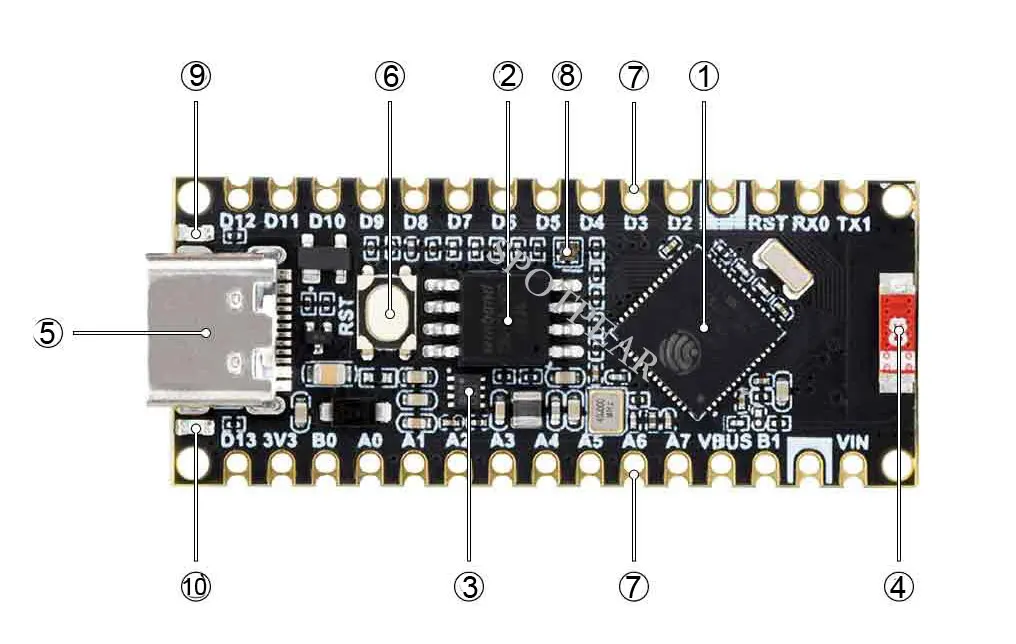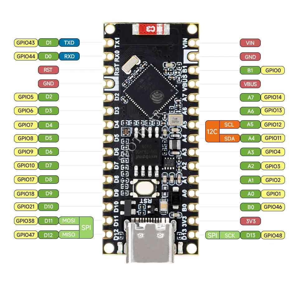 [] ESP32-S3 Nano adopta ESP32-S3R8 como chip principal y es compatible con Arduino Nano ESP32.Es adecuado para aplicaciones como Internet de las cosas o MicroPython, con una apariencia compacta y un rendimiento potente, adecuado para integrar proyectos independientes.