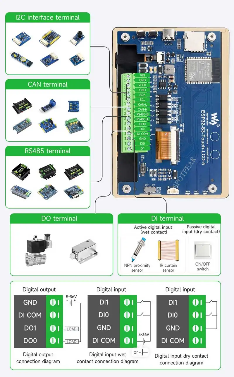 [] CAN integrado, RS485, interfaz I2C y ranura para tarjeta TF, conector de batería GH1.25 2P e interfaces IO aisladas digitales, etc.