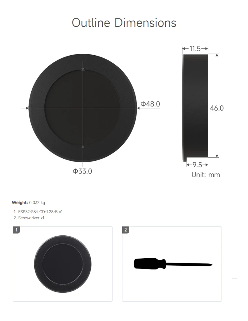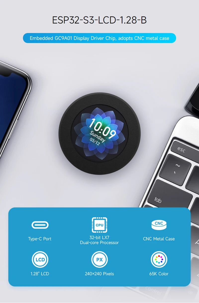 Placa de desarrollo LCD redonda IPS ESP32-S3 de 1,28 pulgadas, procesador de doble núcleo LX7 de 32 bits, controlador de pantalla GC9A01 para ESP32-S3