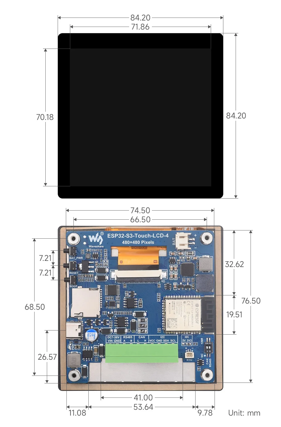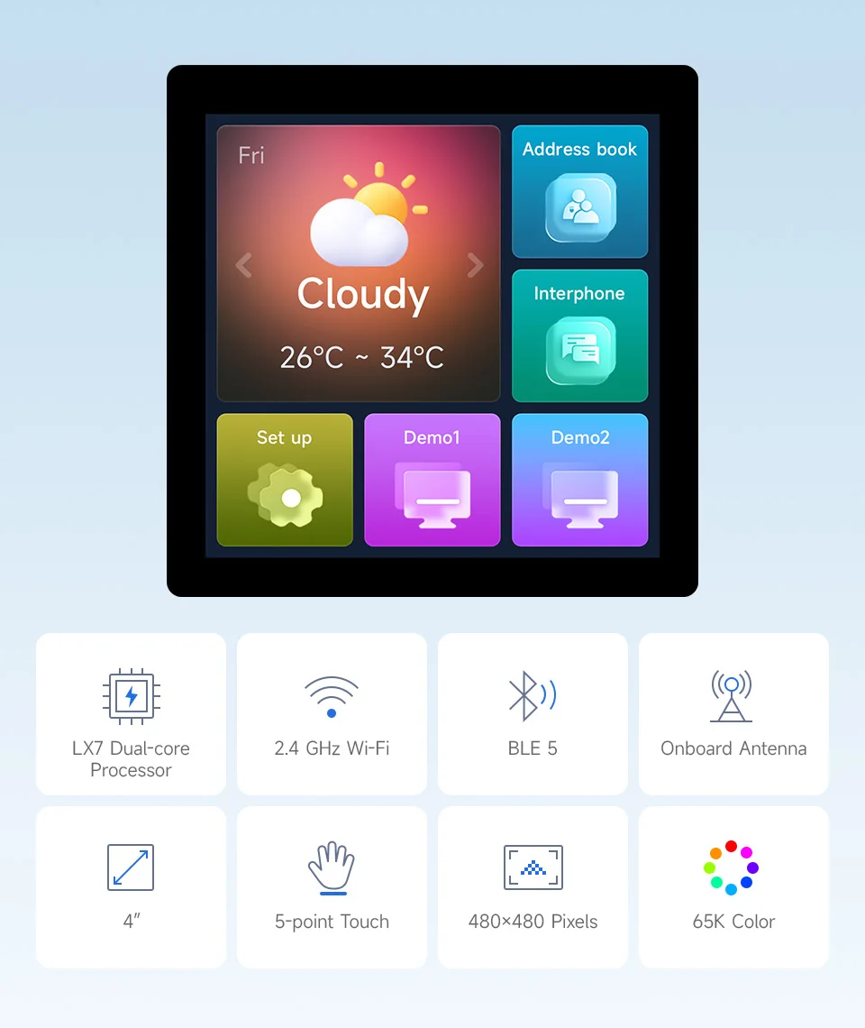 Pantalla táctil capacitiva integrada de 4 pulgadas, resolución de 480×480, color de 65K