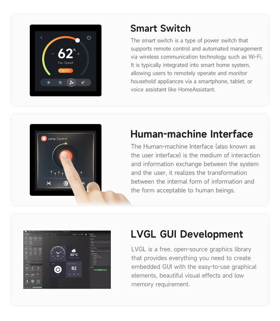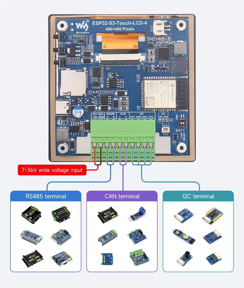 ESP32-S3-Touch-LCD-4 es una placa de desarrollo de microcontrolador con WiFi de 2,4 GHz y soporte BLE 5, integra 16 MB de Flash y 8 MB de PSRAM.La pantalla táctil capacitiva integrada de 4 pulgadas y 480 × 480 puede ejecutar sin problemas programas GUI como LVGL.Combinado con varias interfaces periféricas para desarrollar rápidamente la HMI de ESP32-S3, adecuada para escenarios como panel de control inteligente, puerta de enlace doméstica, panel interactivo inteligente, control industrial y control de iluminación inteligente.