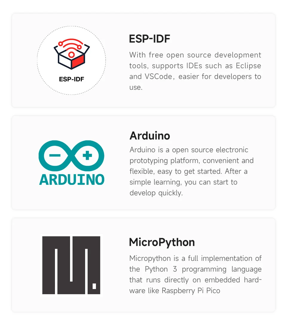 Puede elegir ESP-IDF, Arduino, MicroPython u otros entornos de desarrollo en software para poder iniciarlo y aplicarlo fácil y rápidamente al producto.