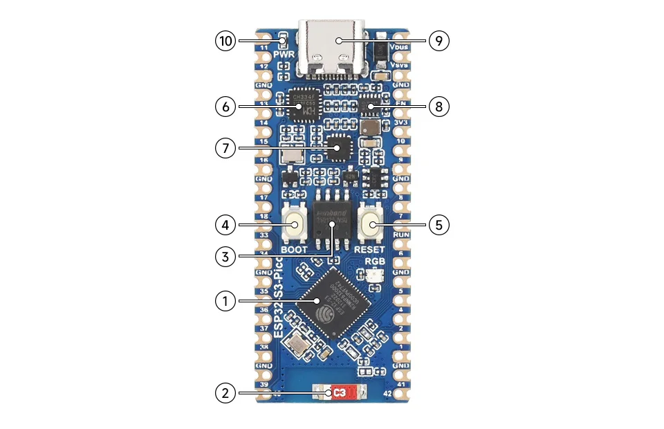 Nota: SPI, I2C, UART y otras interfaces se pueden mapear a la mayoría de los GPIO a través de GPIO Matrix y IO MUX; consulte la hoja de datos ESP32-S3 para obtener más detalles.