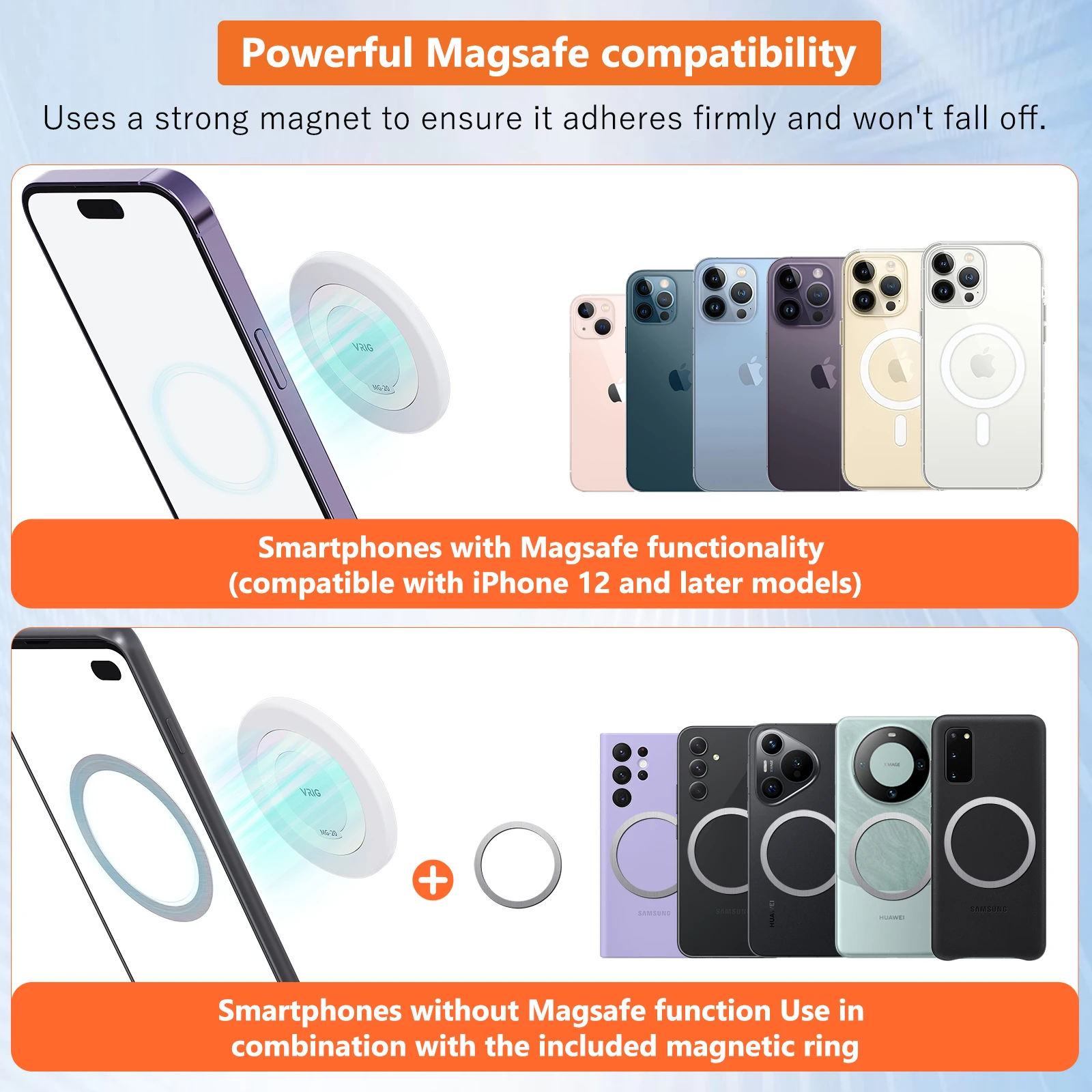 Compatible with Multiple Phones: It is not limited to Magsafe iPhones only. It can be used with non-Magsafe models by simply attaching it to magnetic phone cases or magnetic rings. This versatility ensures that no matter what phone you have, you can still enjoy the benefits of our innovative and practical design.