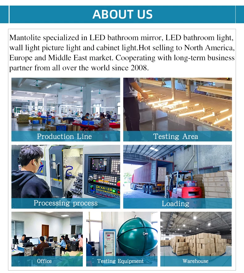 P5. ¿Cómo proceder con un pedido de lámpara de espejo? R: En primer lugar, háganos saber sus requisitos o aplicación. En segundo lugar, cotizamos de acuerdo con sus requisitos o nuestras sugerencias. En tercer lugar, el cliente confirma las muestras y realiza el depósito para un pedido formal. En cuarto lugar, organizamos la producción.