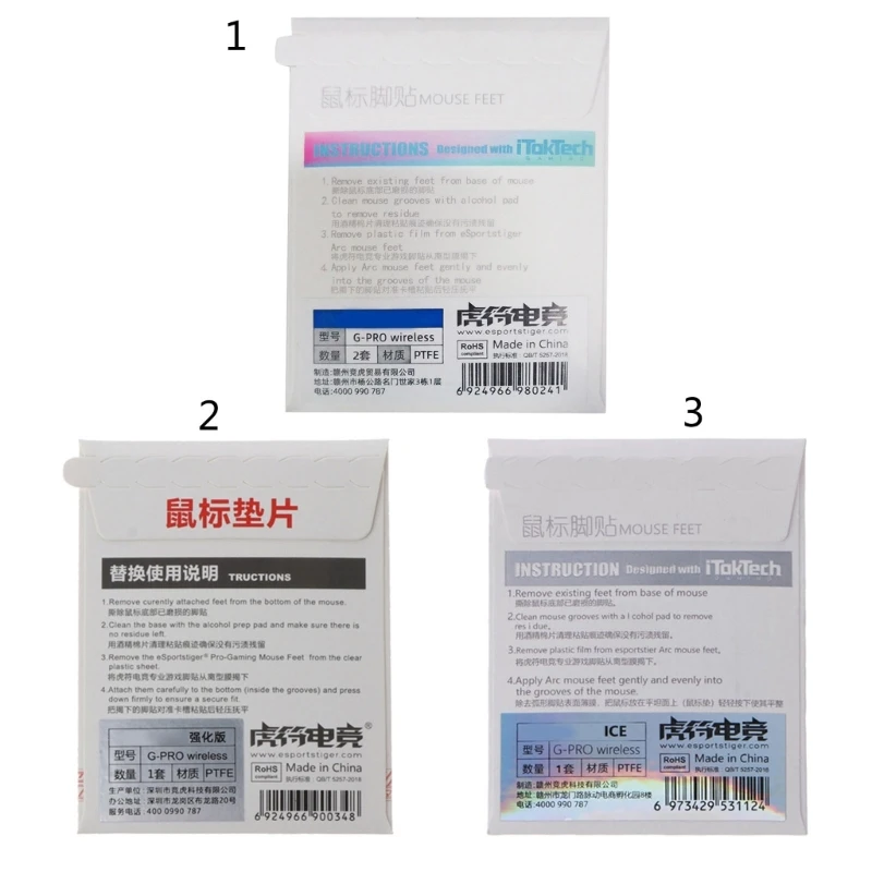 Nota: Este producto es un pie de ratón de repuesto. Después de quitar la pegatina original del pie del ratón, limpie la parte inferior de la cáscara con el algodón que se adjunta en el paquete y luego pegue los nuevos pies del ratón.