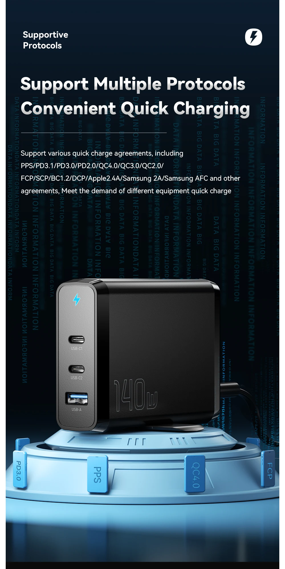 Característica 4: Soporte multiprotocolo, para PPS PD3.1 PD3.0 PD2.0 QC4.0.QC3.0 QC2.0 FCP SCP BC1.2 DCP Apple2.4A Samsung 2A Samsung AFC y muchos mo.