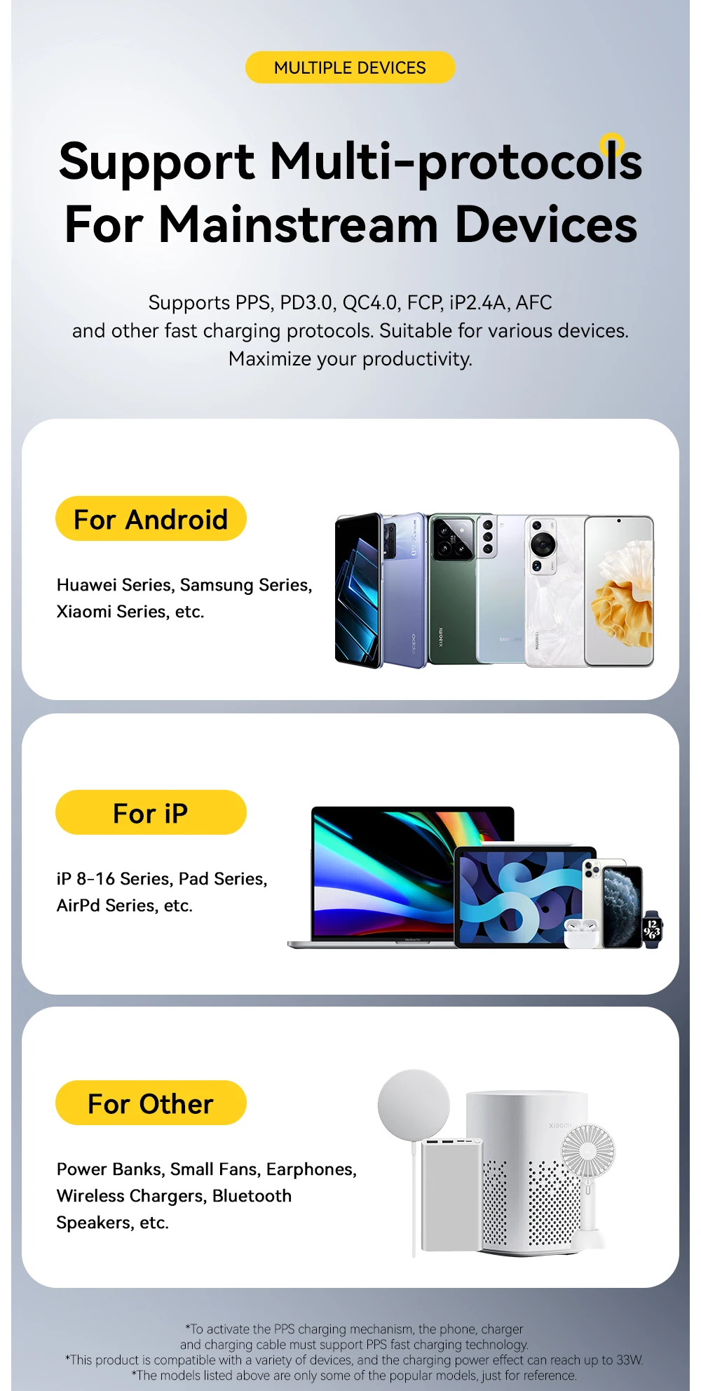 7. Support protocols: PPS PD3.0 PD2.0 QC4.0 QC3.0 QC2.0 FCP SCP BC1.2 DCP Apple2.4A Samsung 2A Samsung AFC and many other fast charging protocols.