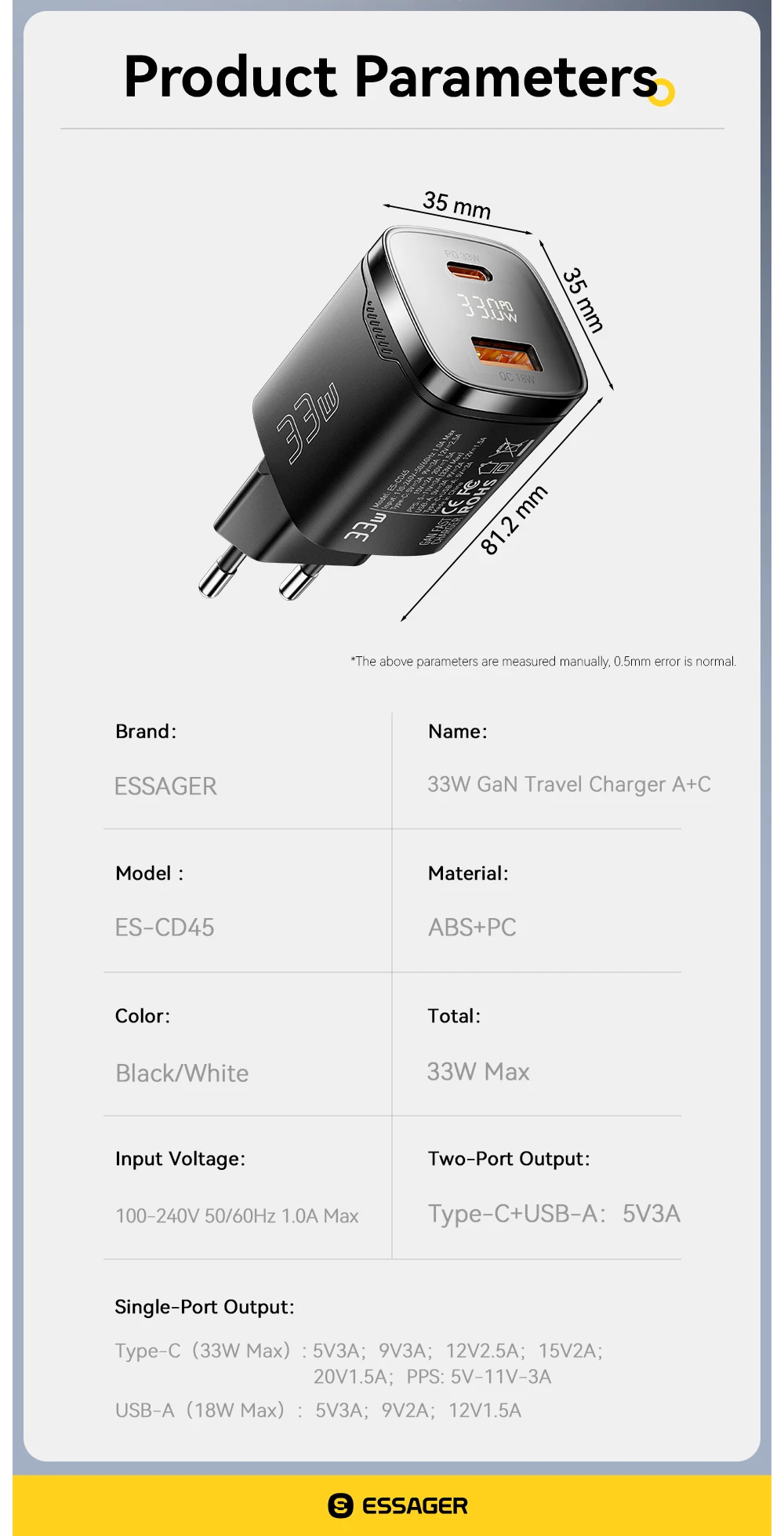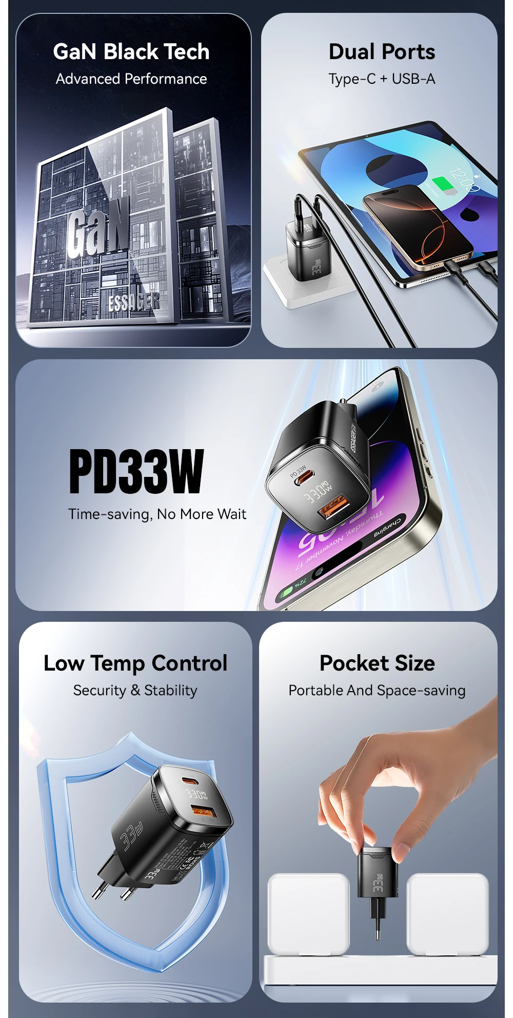 Comprar Essager 33W GaN USB tipo C cargador pantalla Digital PD carga rápida para iPhone 16 15 14 Pro Max iPad Mini 6 Xiaomi Samsung S22