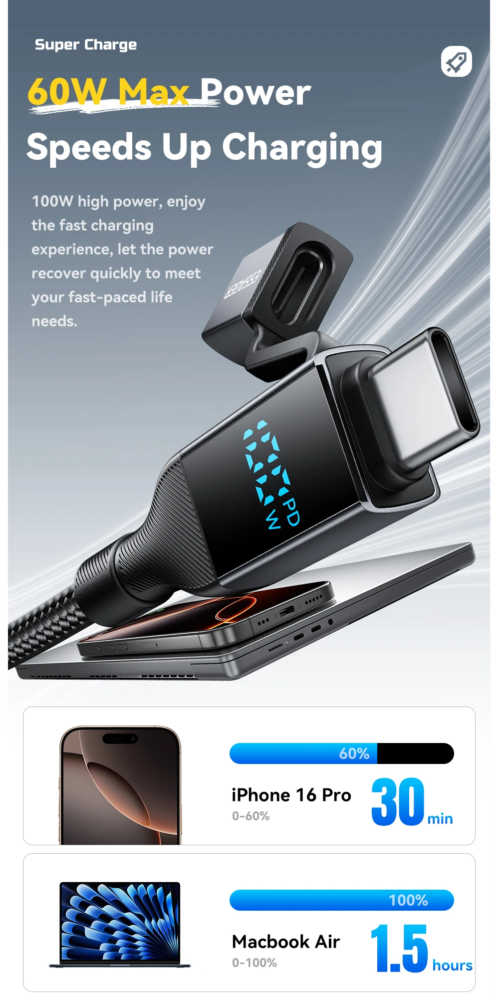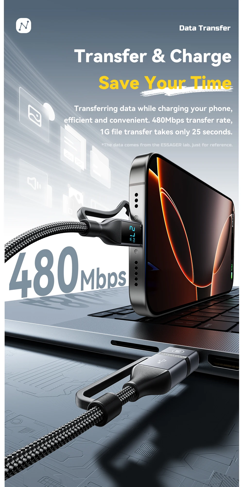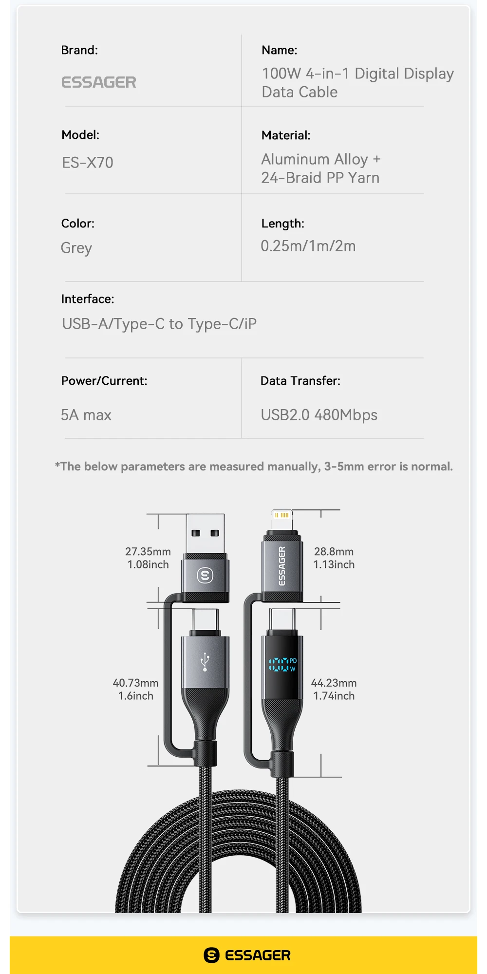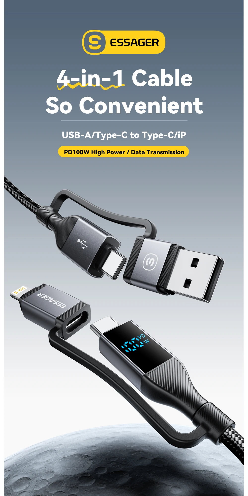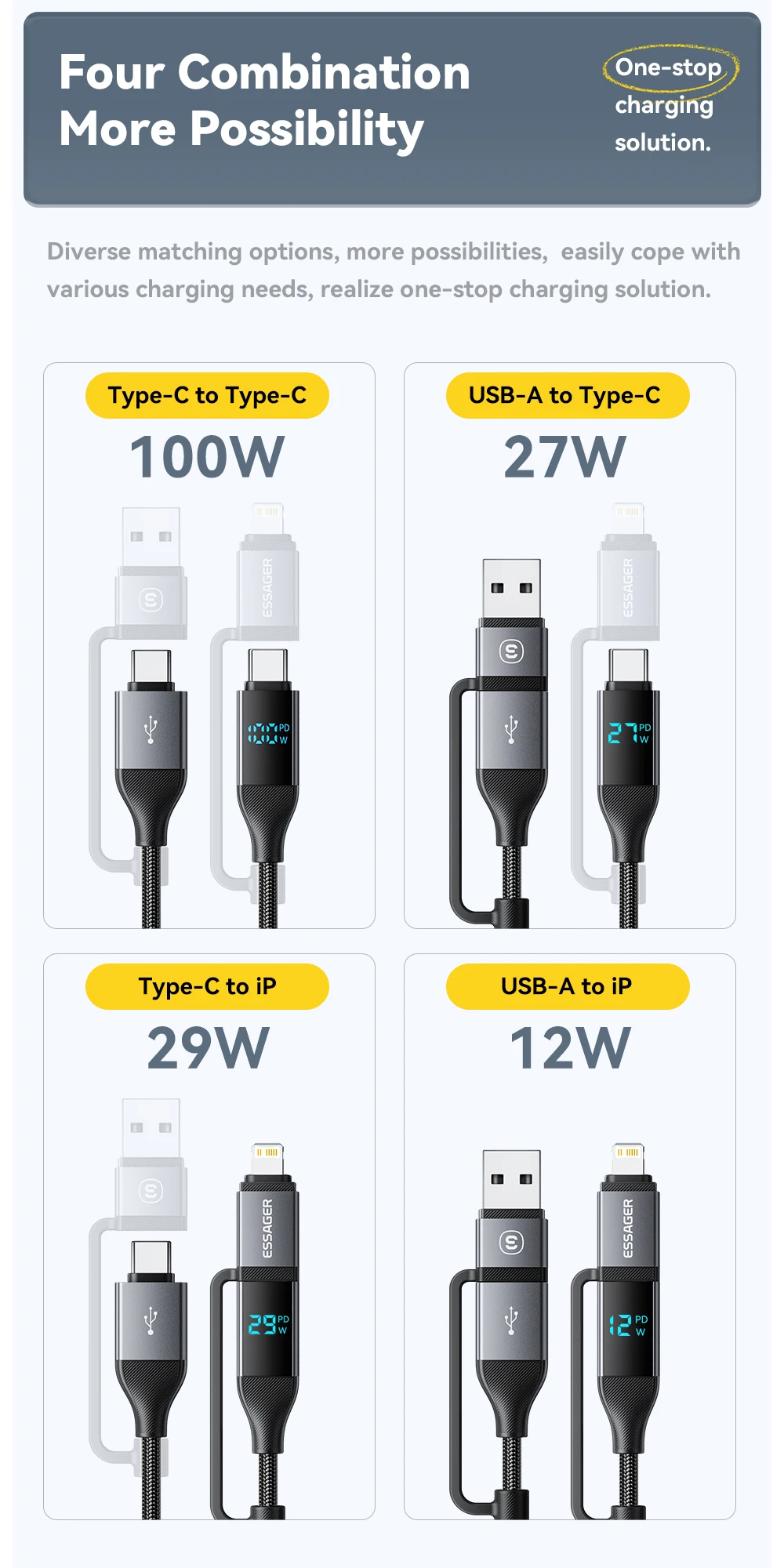 Essager 4 en 1 Cable USB tipo C 100W PD Cable de carga rápida tipo C a Cable tipo C para iPhone16 15 14 Pro Max iPad Samsung Xiaomi
