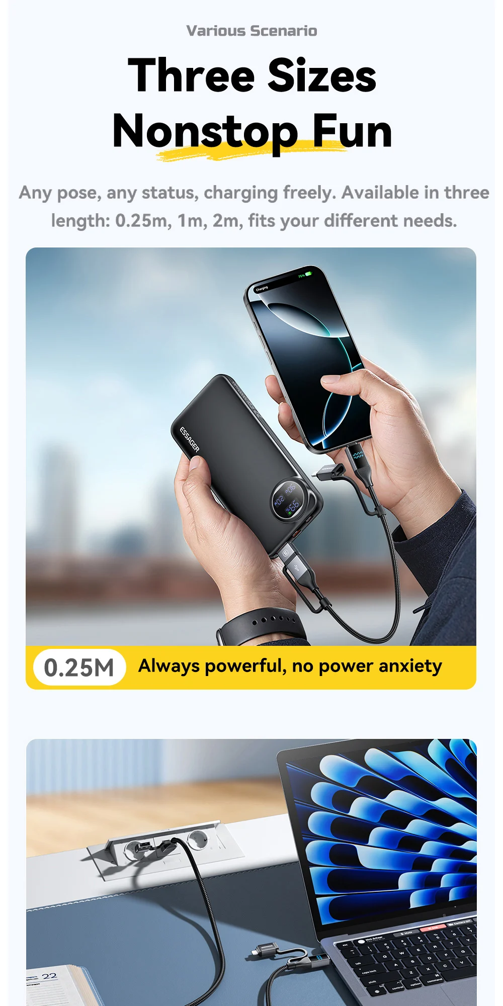 El cable es resistente y tal como se describe. La pantalla que muestra la potencia a la que se está cargando su dispositivo es un toque adicional. Ofrece una carga súper rápida en mi Samsung S21 Ultra y una carga rápida en mi iPhone. El conector tipo A y Lightning incluido es muy conveniente para todas las circunstancias. He llegado a confiar en la marca Essager para cumplir exactamente con lo que promete. Recomiendo al 100% el producto y al vendedor. Fue entregado en exactamente 2 semanas a través de Speedaf. Realicé el pedido a través de la sección de artículos en paquete.