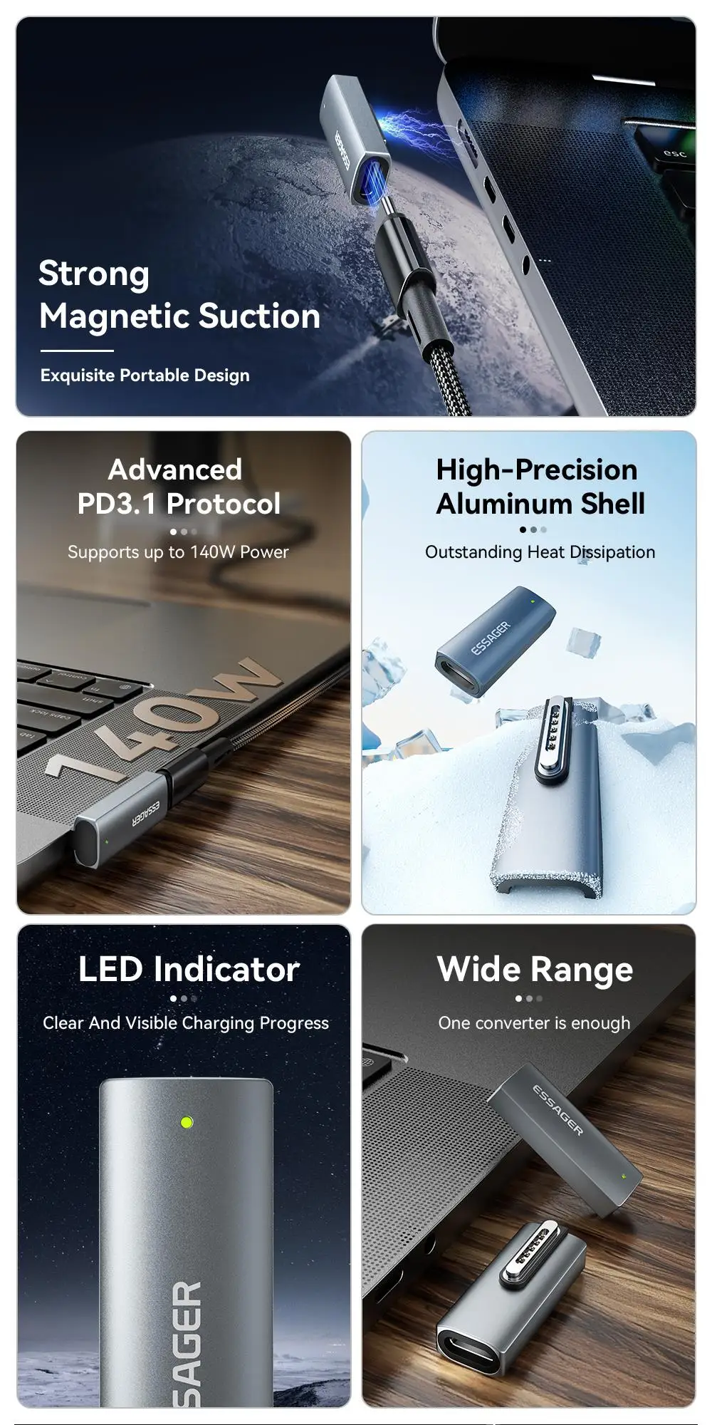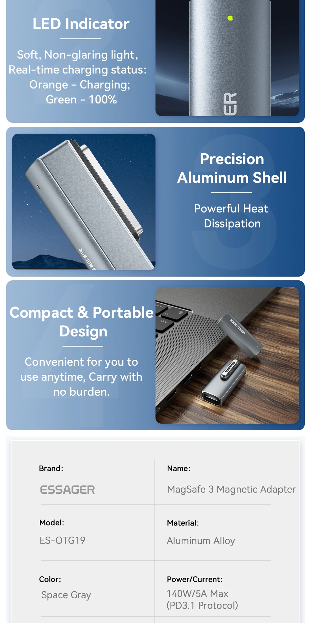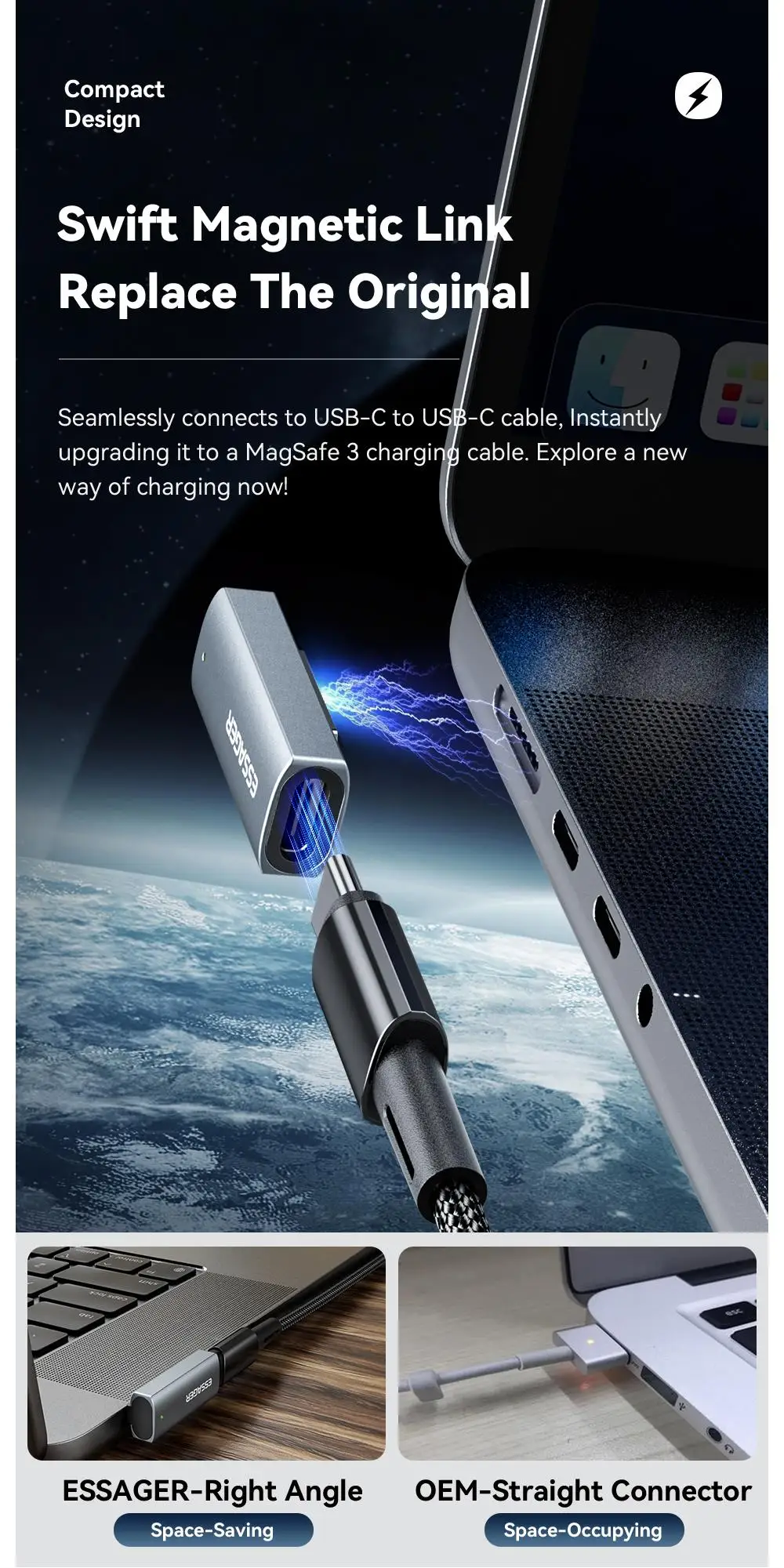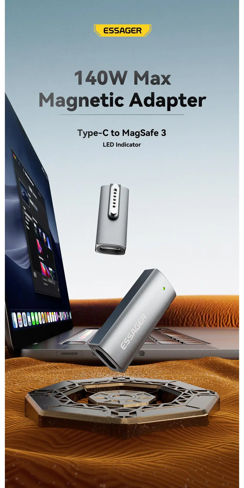 Comprar Essager-adaptador magnético tipo C de 140W para Apple Magsafe 3 MacBook Air Pro 2021-2023, convertidor de carga rápida USB C con codo de 90 grados