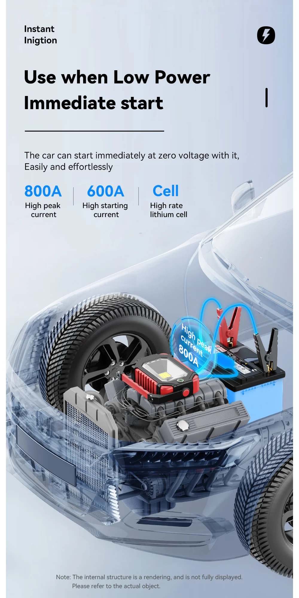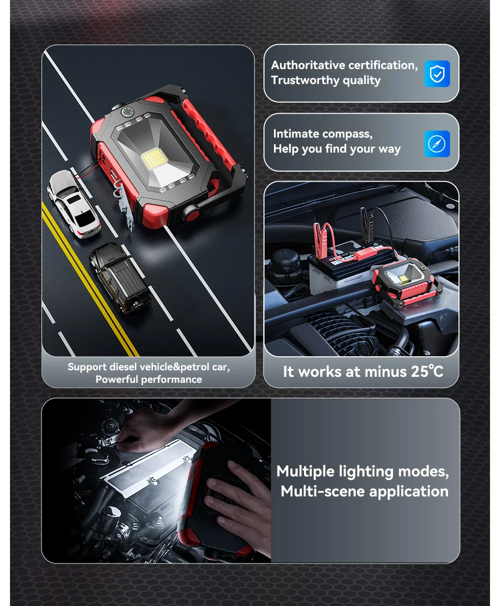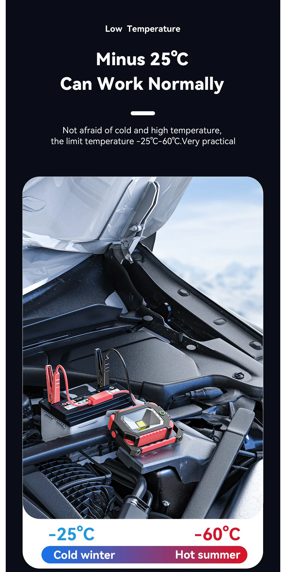 2. High-rate lithium battery, 600A high and strong starting current, 800A peak current, not afraid of severe cold and high temperature, the car will start immediately after hitting it, and will not hurt the car