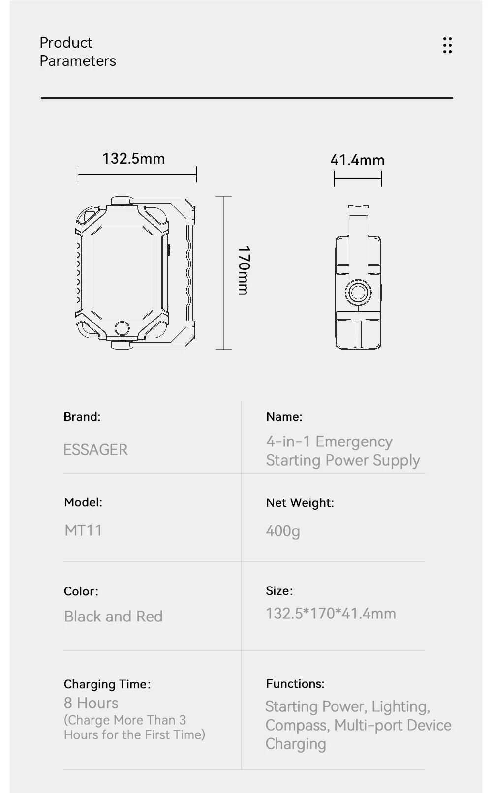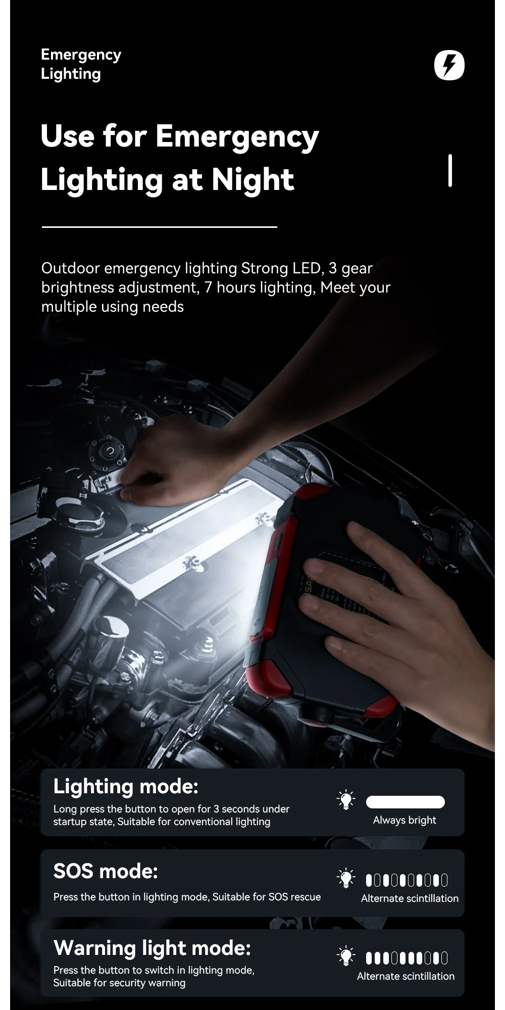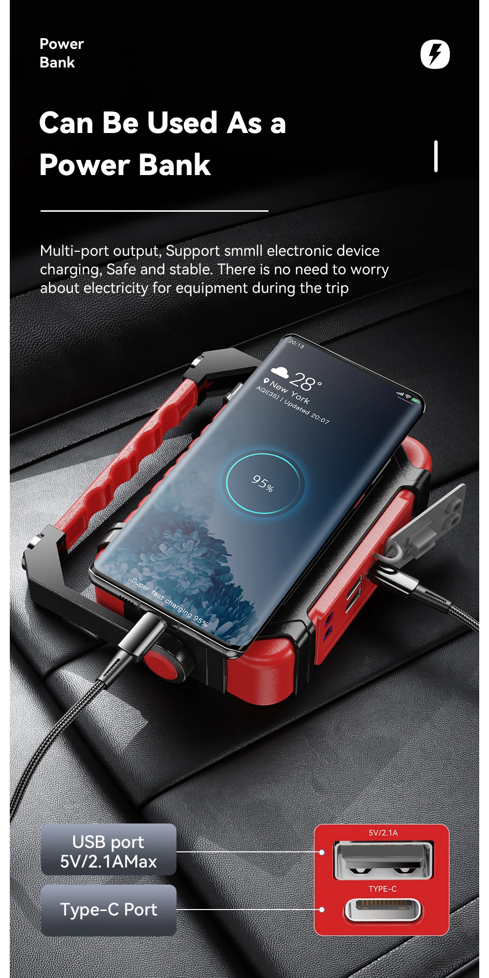 Functions:Power on, lighting, compass, multi-port device charging
