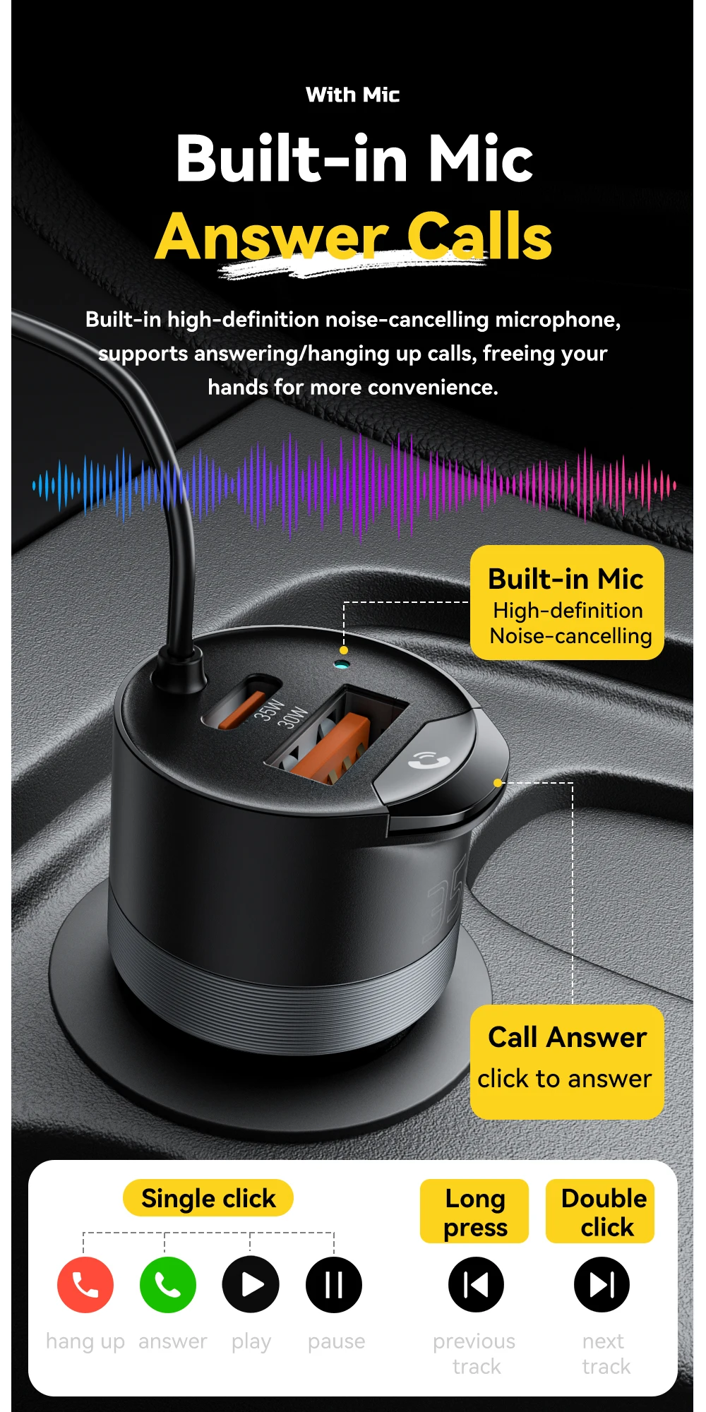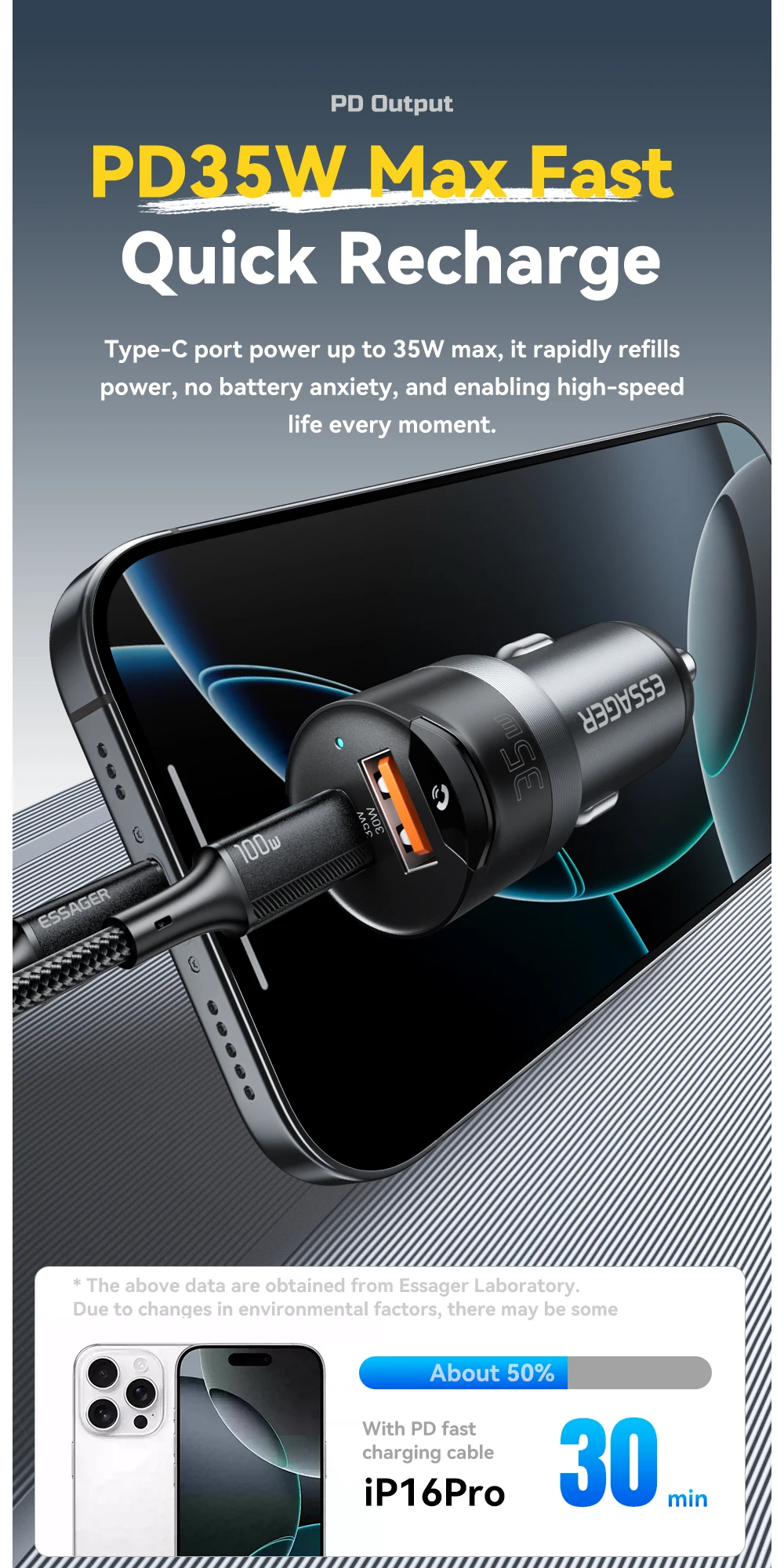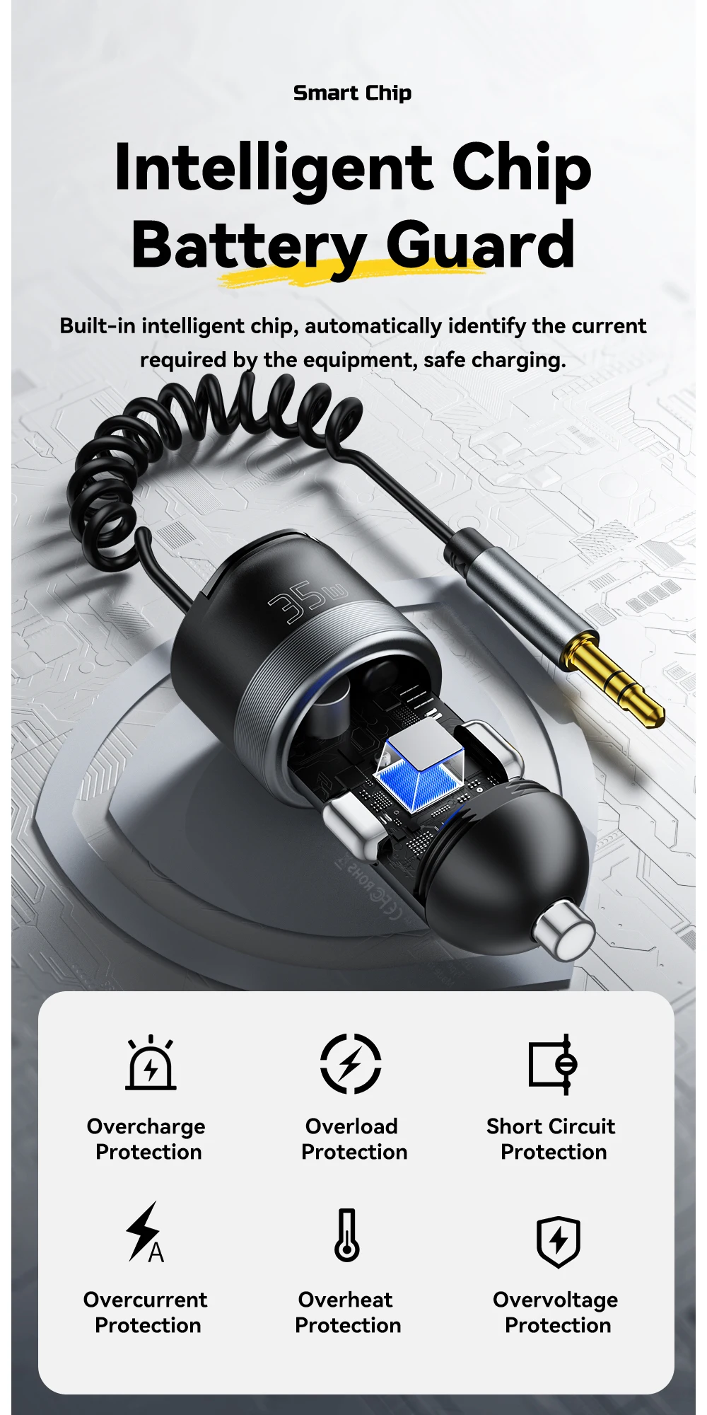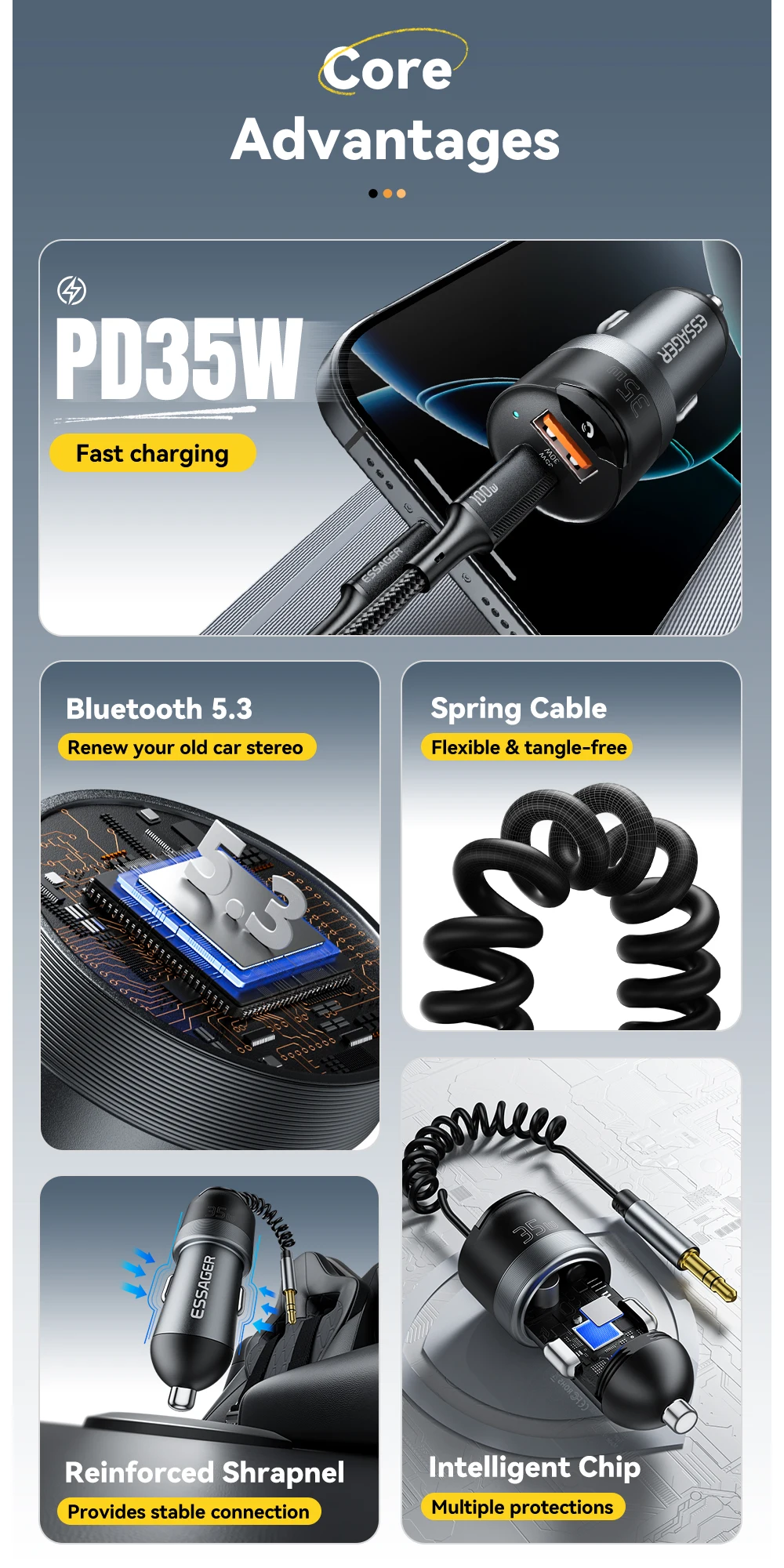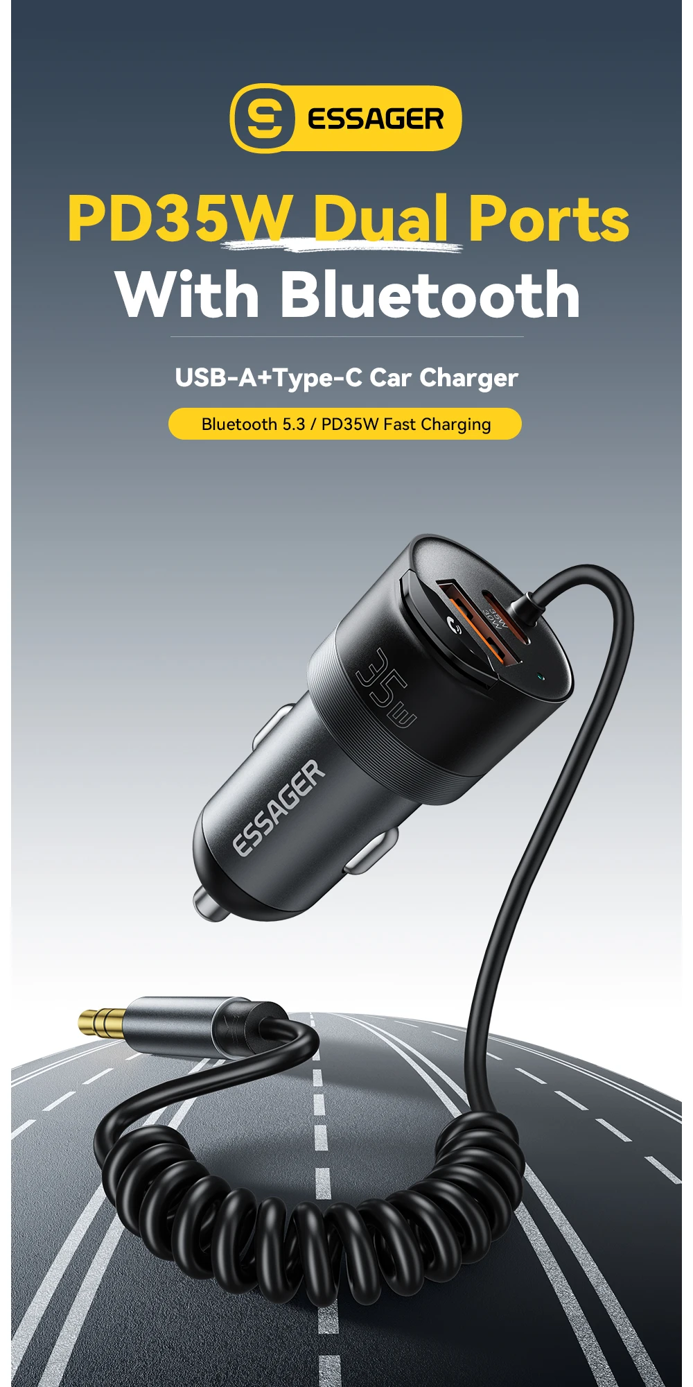 Essager Bluetooth 5,3 cargador de coche adaptador auxiliar de 3,5mm PD35W QC30W cargador rápido de coche para iPhone 16 15 Pro Huawei Xiaomi Samsung iPad