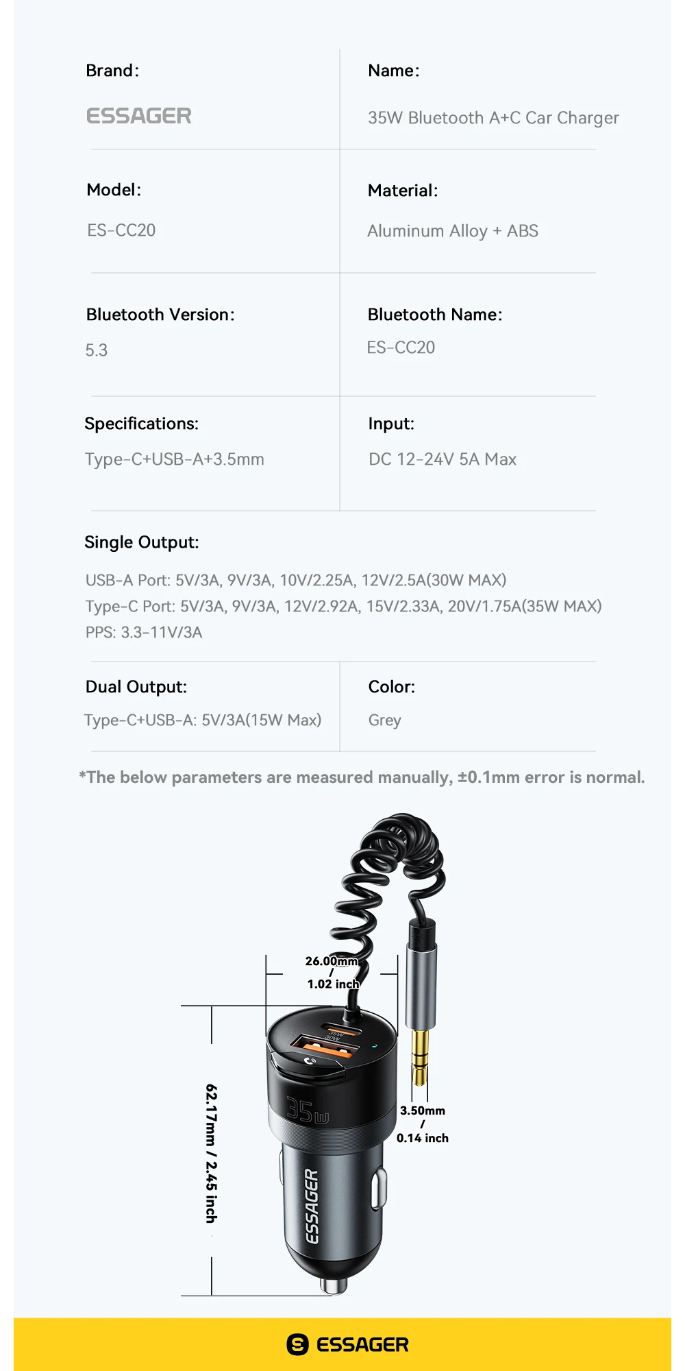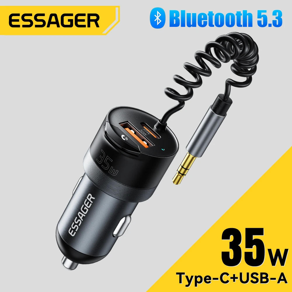 Comprar Essager Bluetooth 5,3 cargador de coche adaptador auxiliar de 3,5mm PD35W QC30W cargador rápido de coche para iPhone 16 15 Pro Huawei Xiaomi Samsung iPad