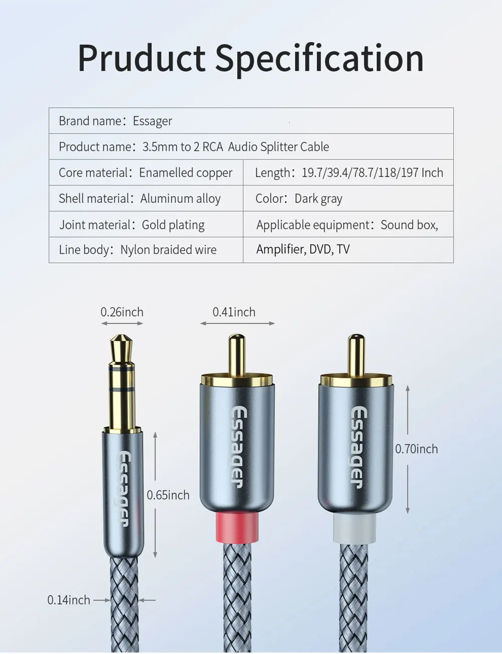 Product Name: Essager Sound 3.5mm Turn Double Lotus Head RCA Audio Adapter Cable